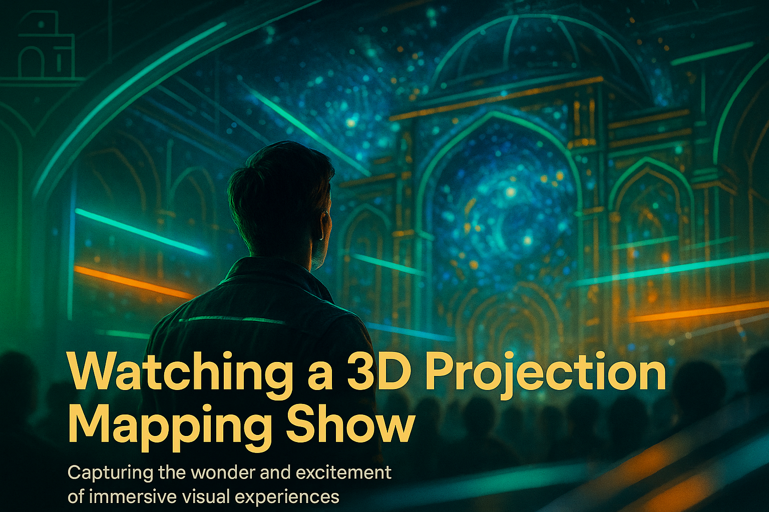 /Collection: /by davooda/Type: PNG/A visually captivating illustration depicting an audience watching a 3D projection mapping show, showcasing vibrant colors and dynamic lighting, perfect for promoting immersive visual experiences.