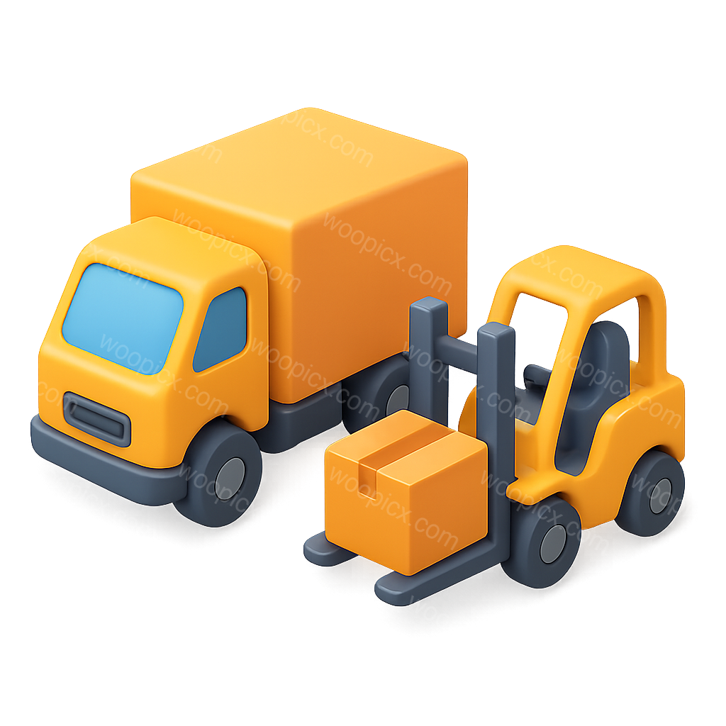 /Premium/Collection: /by davooda/Type: PNG/A vibrant 3D icon featuring a yellow truck and a forklift, designed in an isometric view. The truck has a boxy shape with blue windows, while the forklift is lifting a box, creating a dynamic and playful look.