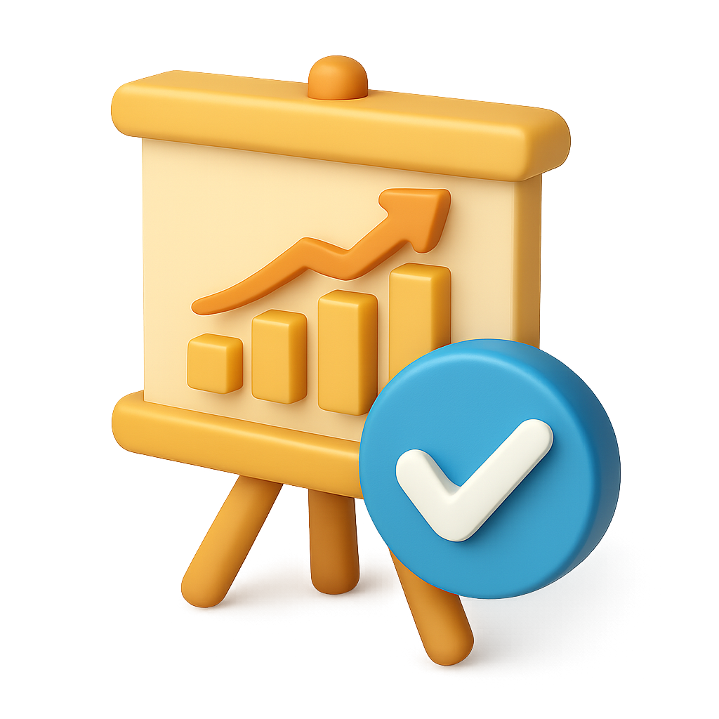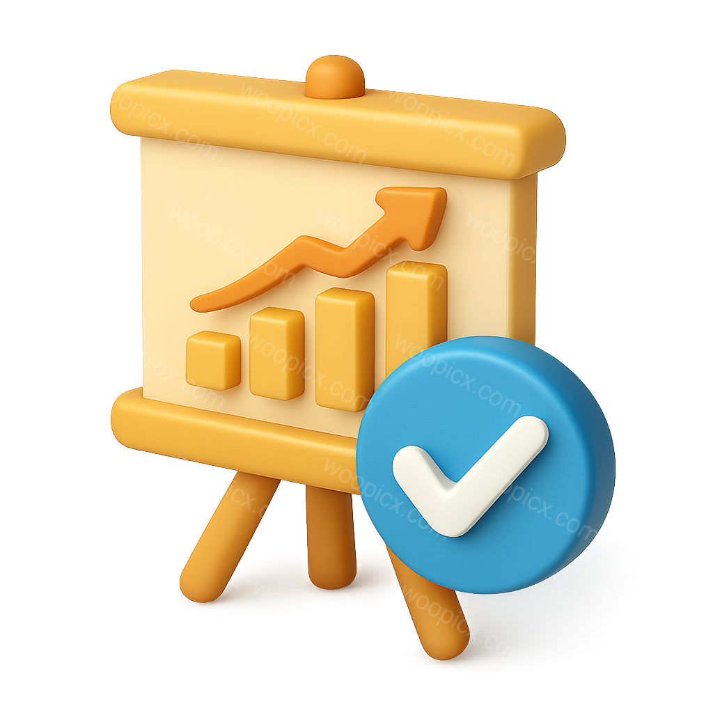 A visually appealing 3D icon featuring a chart with upward trends and a checkmark, symbolizing growth and success. The design has a transparent background and a warm gradient.