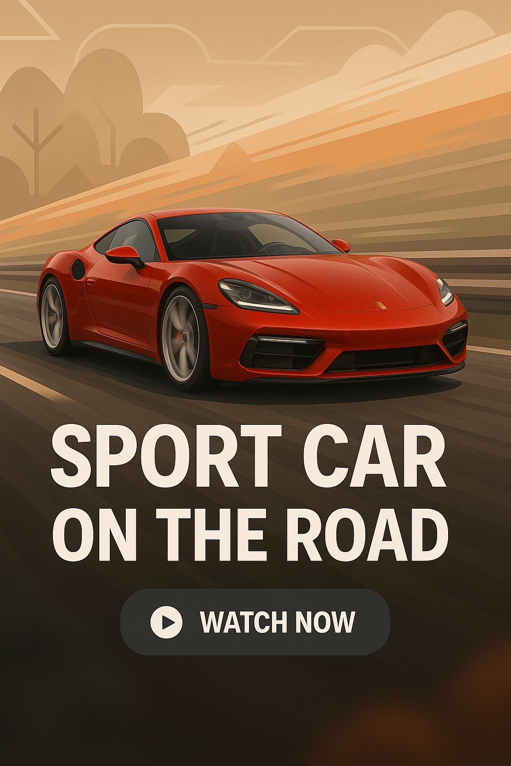 Vibrant promotional image featuring a sleek red sports car on a stylized road, designed for video content. The modern aesthetic and bold typography aim to attract car enthusiasts.