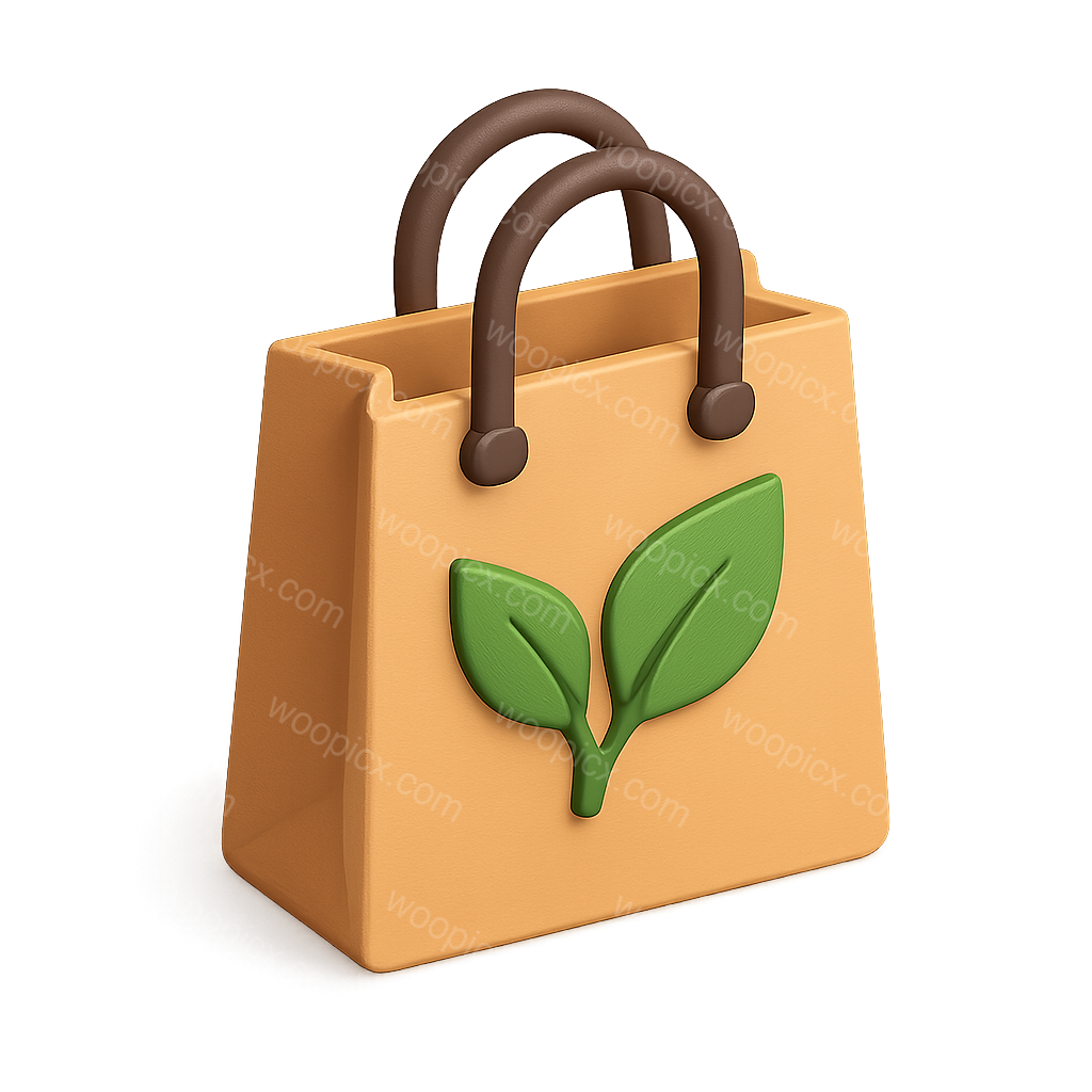 A 3D icon of a shopping bag designed with a leaf motif, featuring a three-quarter isometric perspective and a soft, volumetric appearance.