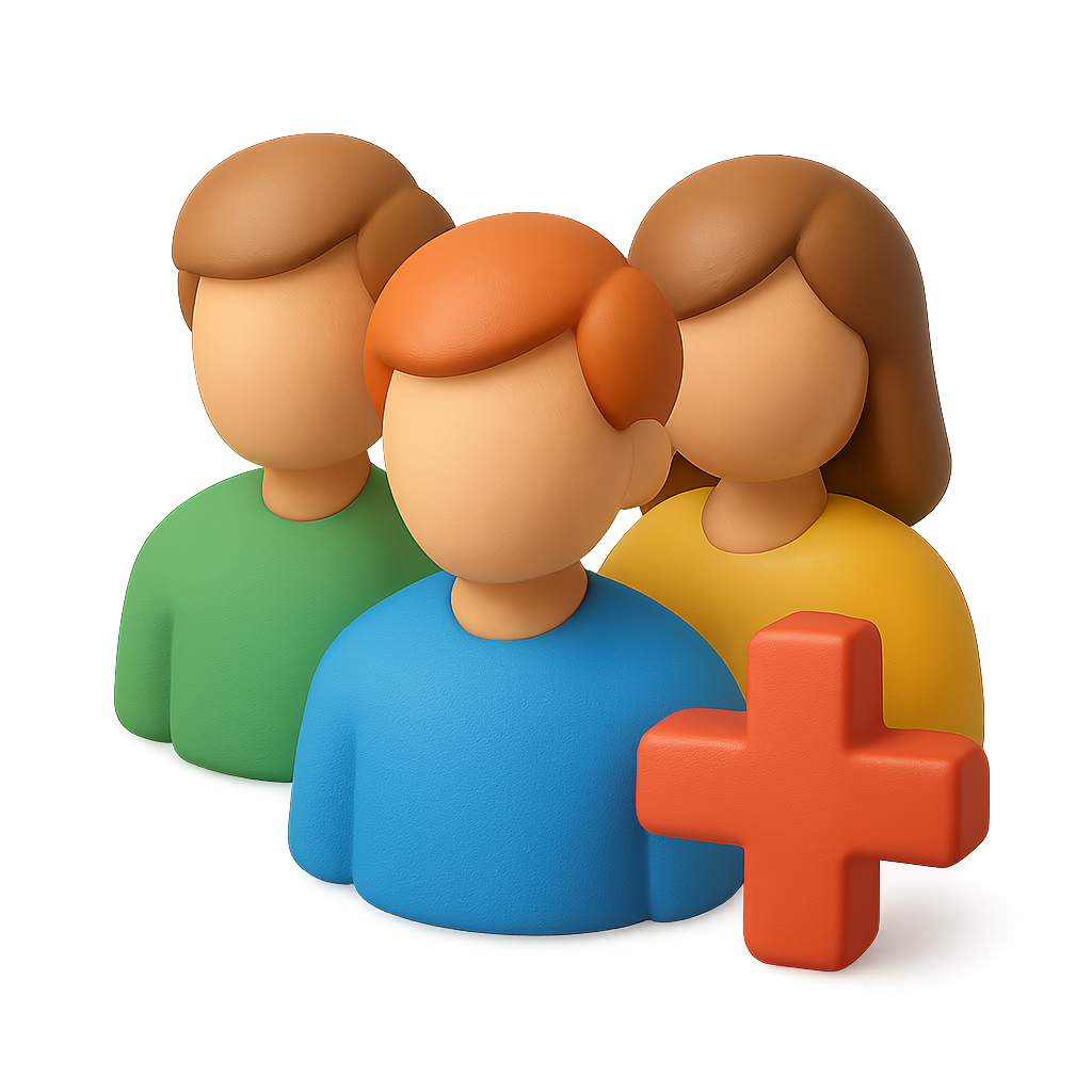 A vibrant 3D illustration featuring three stylized figures in green, blue, and yellow next to a red cross icon. The figures are designed with a smooth, volumetric style, set against a soft gradient background.