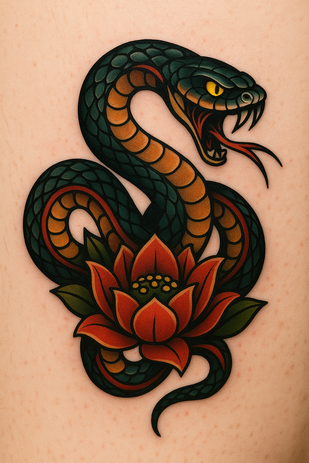 This image showcases a striking tattoo design featuring a snake entwined around a lotus flower, highlighting bold colors and intricate details. Ideal for tattoo enthusiasts and artists.