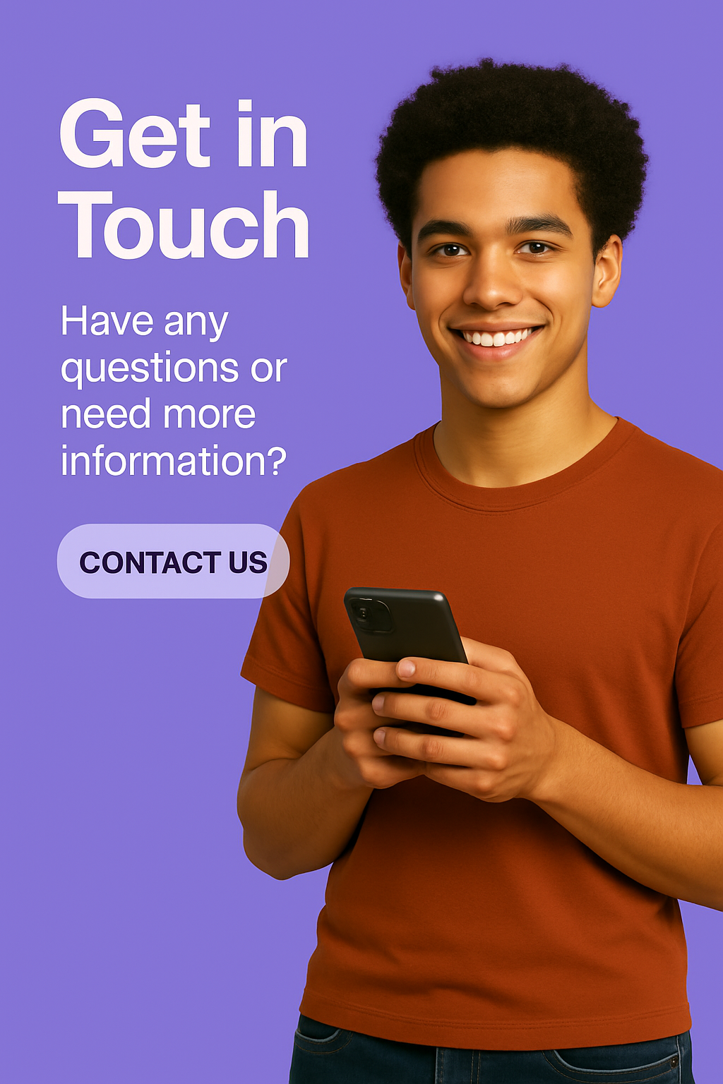 An inviting social media post featuring a young man holding a smartphone against a vibrant purple background, encouraging viewer interaction and inquiries.