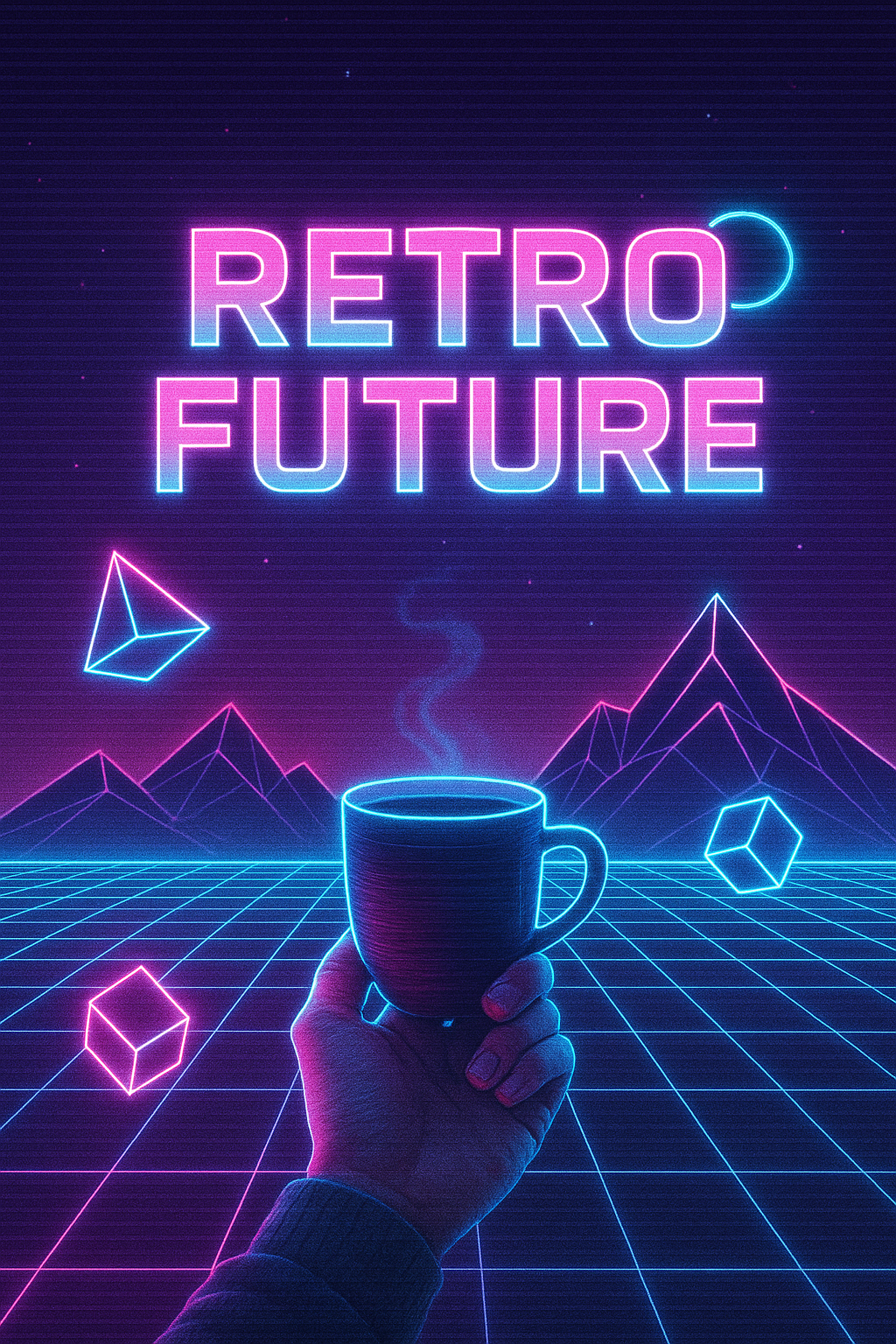 A hand holds a steaming cup of coffee against a vibrant retro-futuristic landscape. The scene features neon geometric shapes, glowing mountains, and a grid floor, embodying an 80s aesthetic.