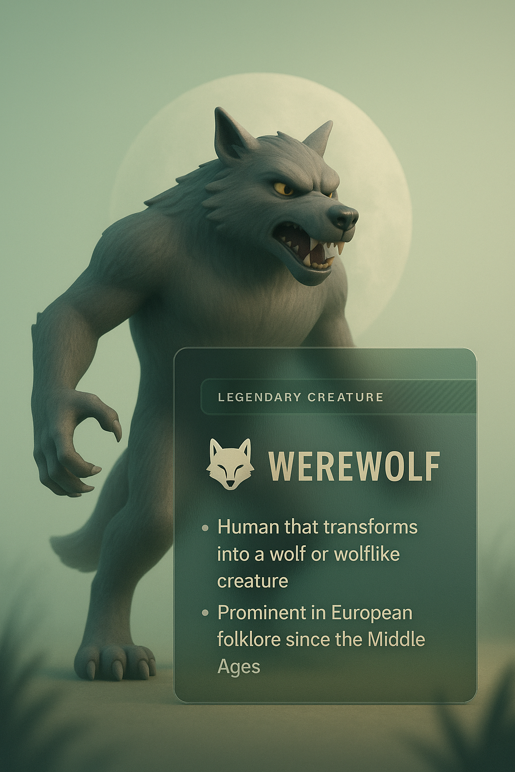 /Collection: /by davooda/Type: PNG/A 3D illustration of a fierce werewolf standing against a softly illuminated background. The design features an integrated info panel with text about the creature, enhancing the visual narrative.