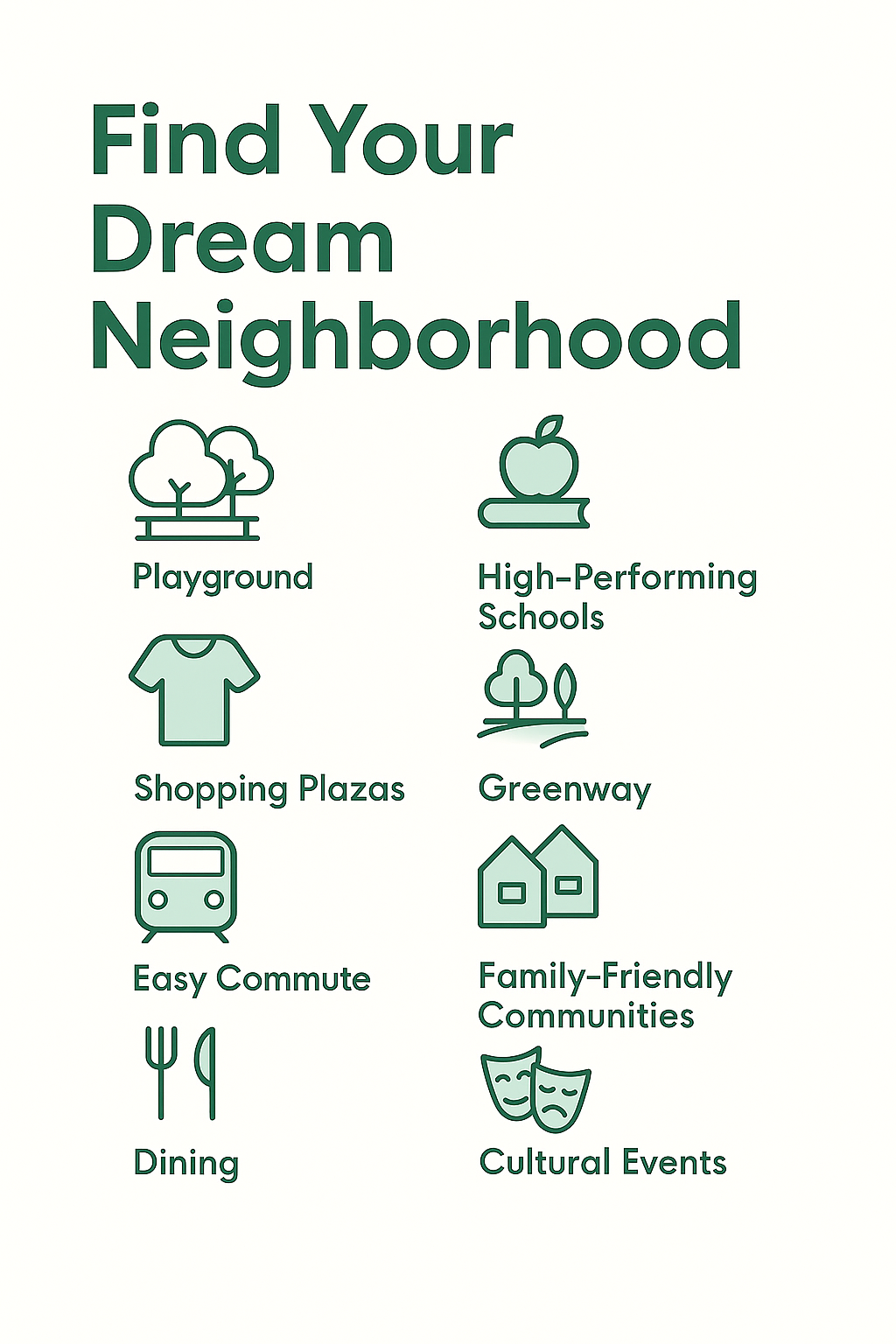 Informative graphic showcasing key features of desirable neighborhoods. Includes icons for amenities like schools and dining, designed for real estate marketing.
