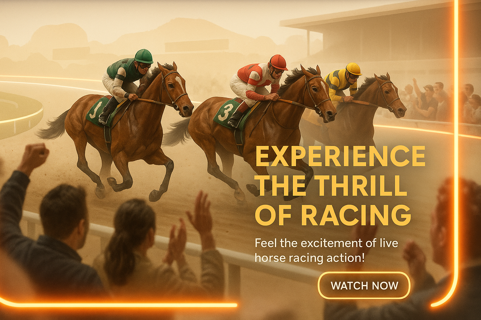 Vibrant promotional banner showcasing an exciting horse racing scene, designed to attract viewers to live racing events. Ideal for sports marketing.