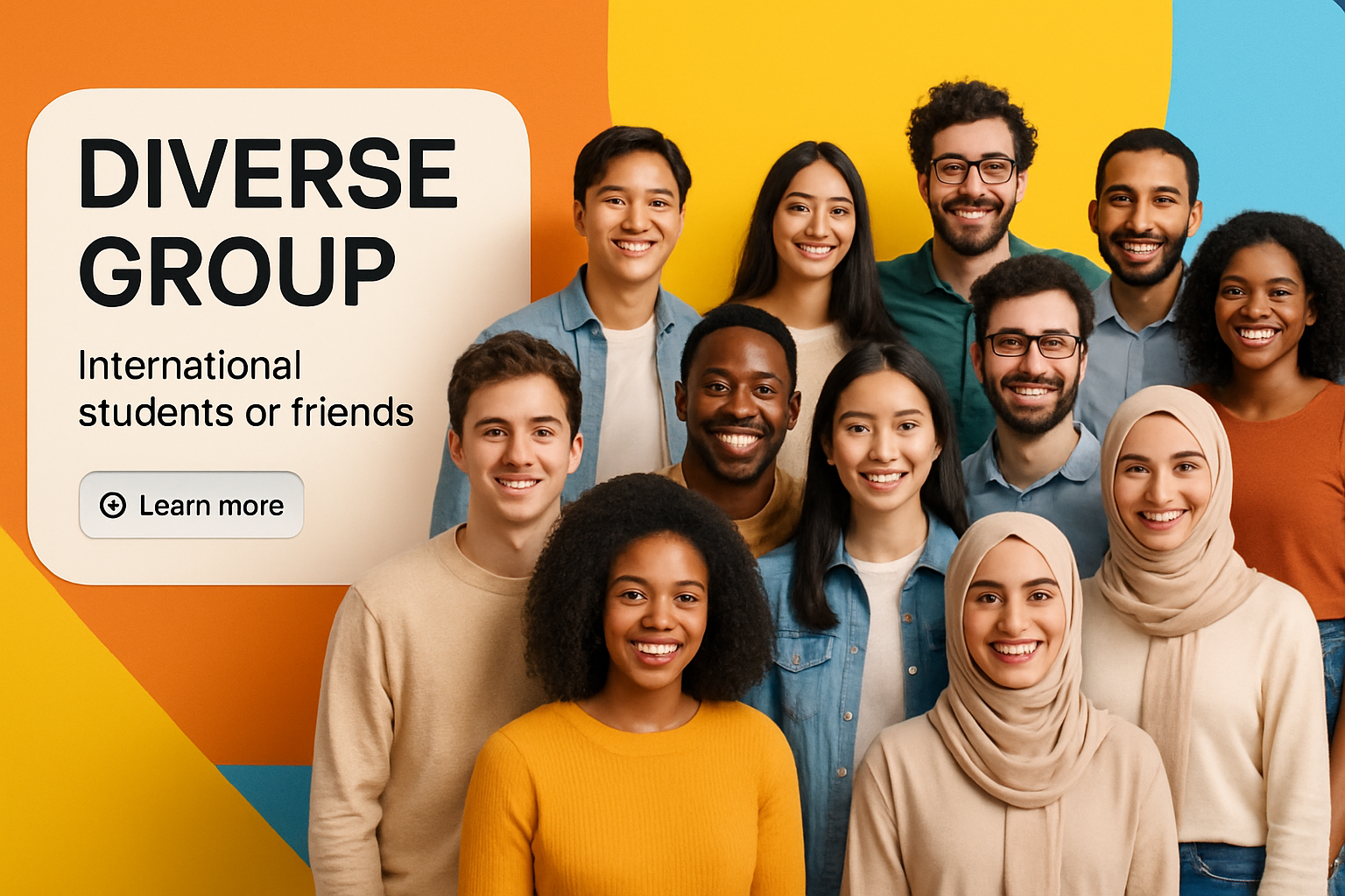 /Collection: /by davooda/Type: PNG/A vibrant gathering of multicultural individuals showcasing diversity among international students and friends. The modern layout features bold typography and bright geometric backgrounds.