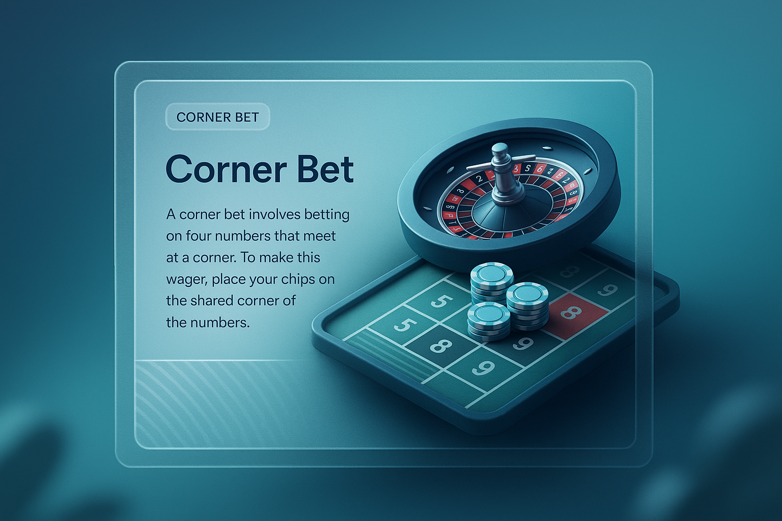 This 3D illustration showcases a corner bet layout featuring a roulette wheel and chips. The design includes a transparent frame, headline, additional graphics, and text, all cohesively integrated.