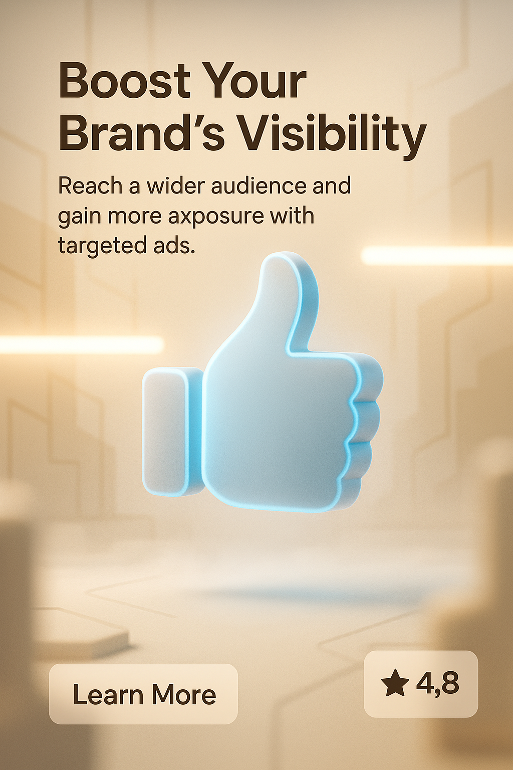 /Collection: /by davooda/Type: PNG/A modern promotional graphic highlighting brand visibility improvement through targeted ads. Features a 3D thumb icon and soft color palette, ideal for digital marketing campaigns.