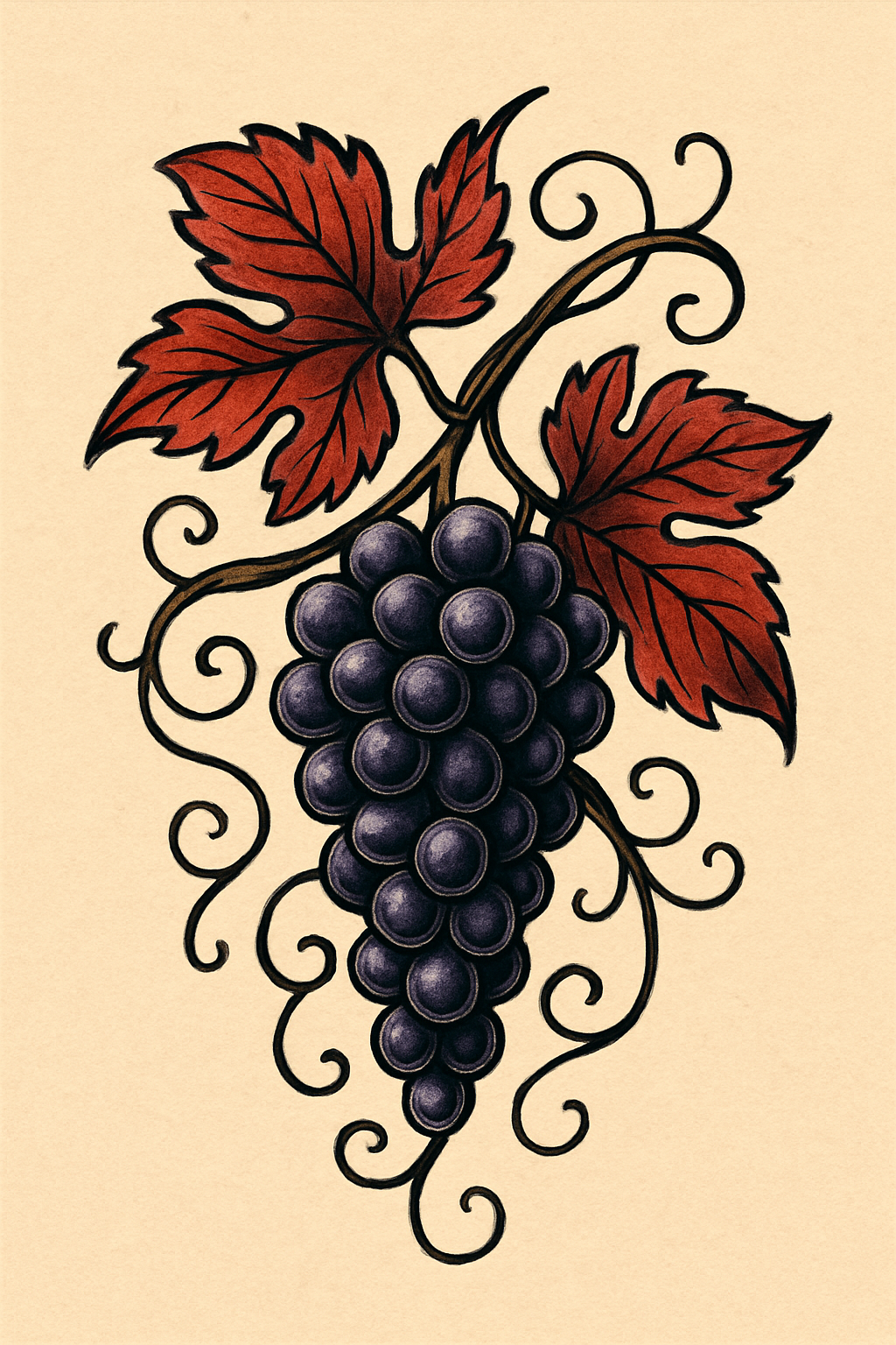 /Collection: /by davooda/Type: PNG/This is a detailed illustration of a grape bunch with stylized leaves and swirling vines. It features a vintage aesthetic, suitable for wine-related branding or decor.