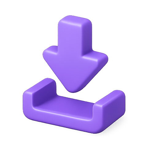 Stylized 3D download icon featuring a purple color scheme, suitable for digital applications, websites, or user interfaces. The design conveys a modern and playful aesthetic.