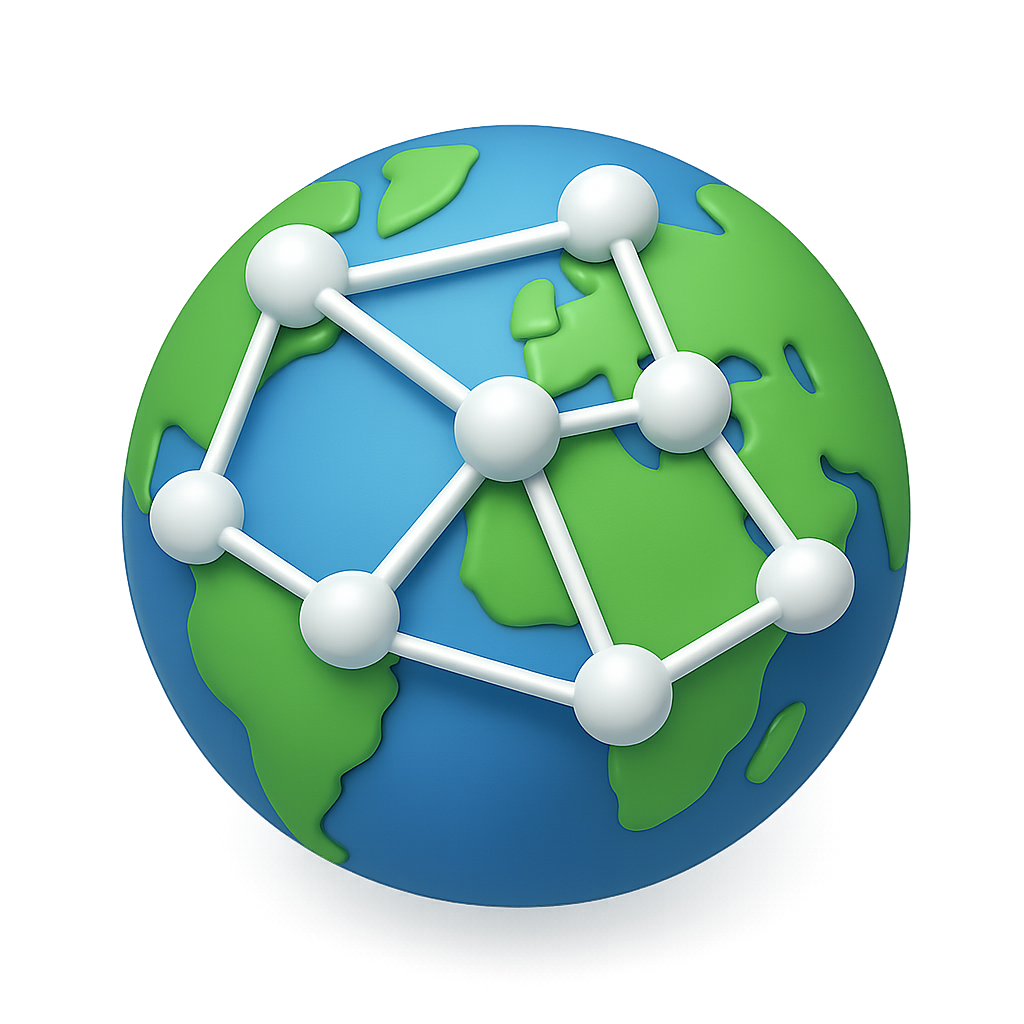 A vibrant 3D globe featuring interconnected nodes, showcasing a network theme. The globe is designed with a transparent background, in a three-quarter isometric view.