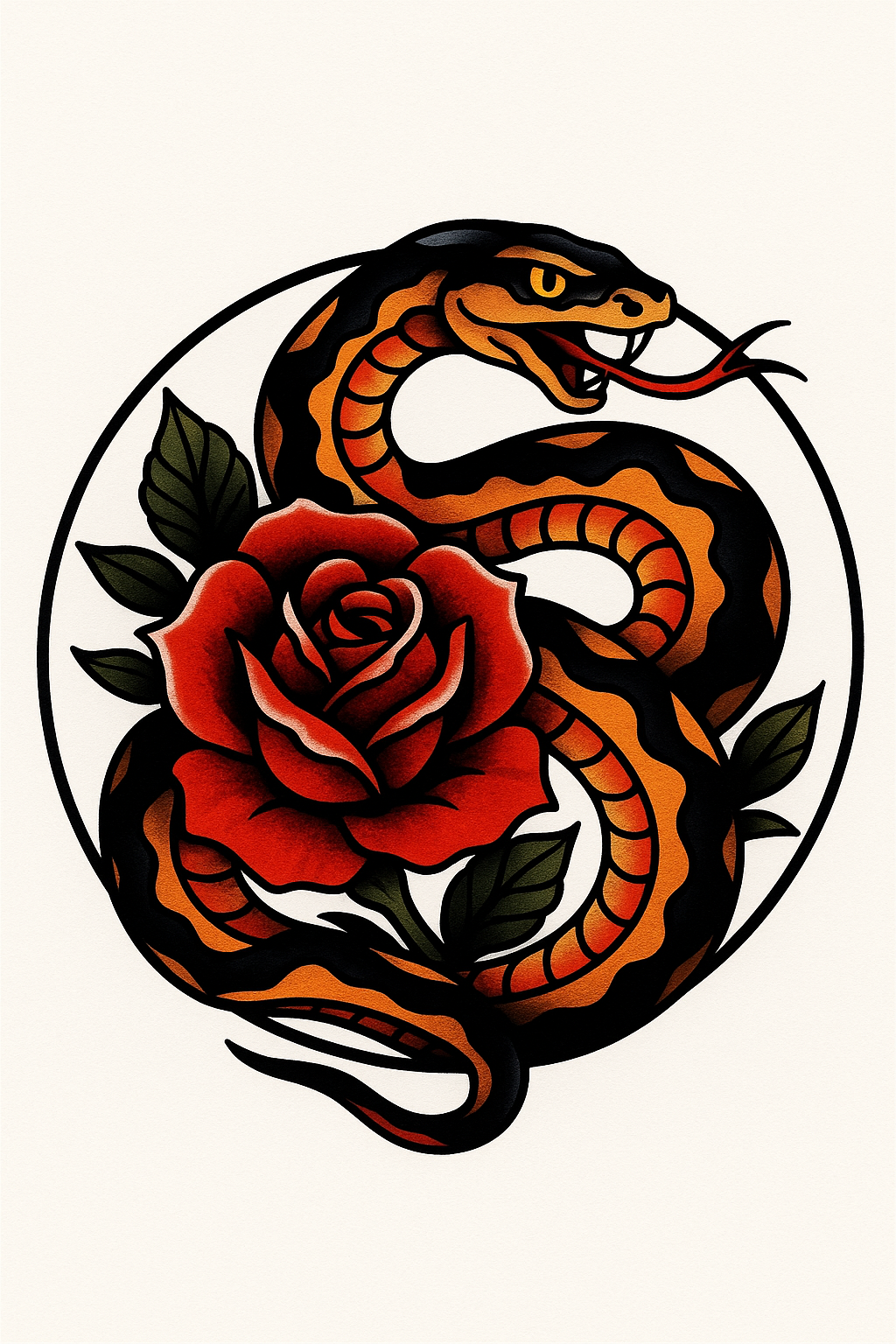 Stylized tattoo illustration featuring a snake entwined around a rose, showcasing bold colors and striking contrast, ideal for tattoo enthusiasts and art lovers.