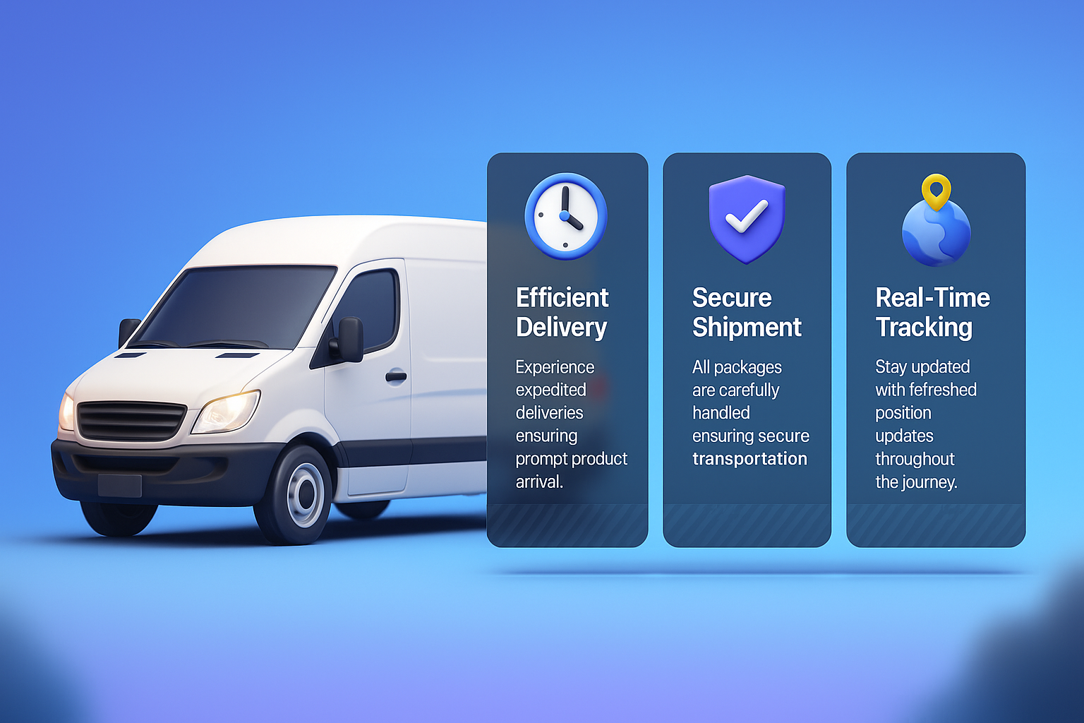 /Collection: /by davooda/Type: PNG/A sleek white delivery van is set against a smooth gradient background. Three feature blocks highlight efficient delivery, secure shipment, and real-time tracking.