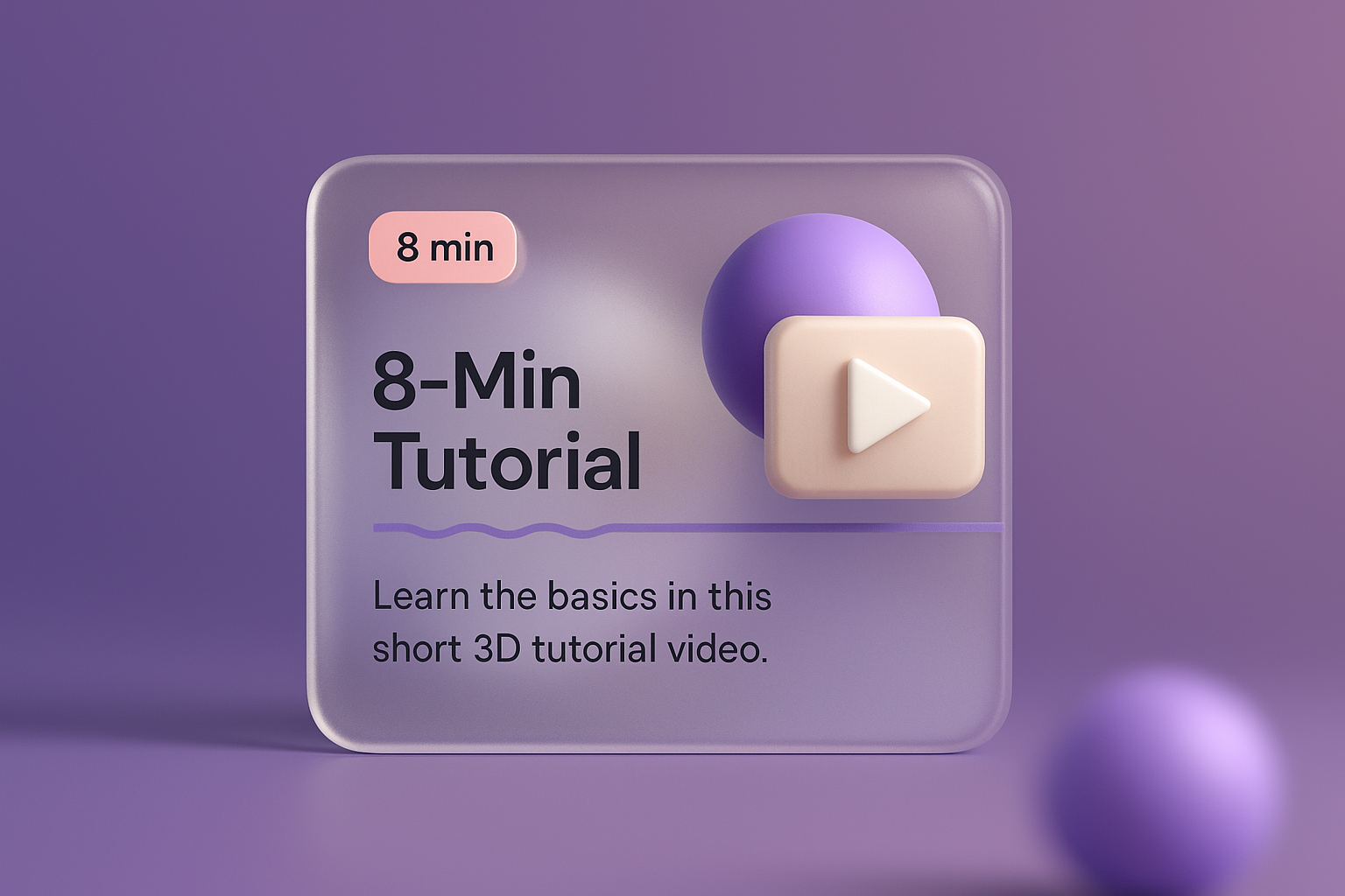A modern 3D illustration depicting a tutorial card featuring a play button, text, and colorful spheres on a gradient background, designed to engage viewers.
