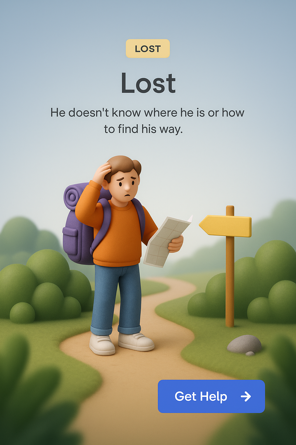 /Collection: /by davooda/Type: PNG/A detailed 3D illustration of a lost traveler standing on a path with a map. The scene features a signpost and a gradient background, creating a sense of depth and realism.