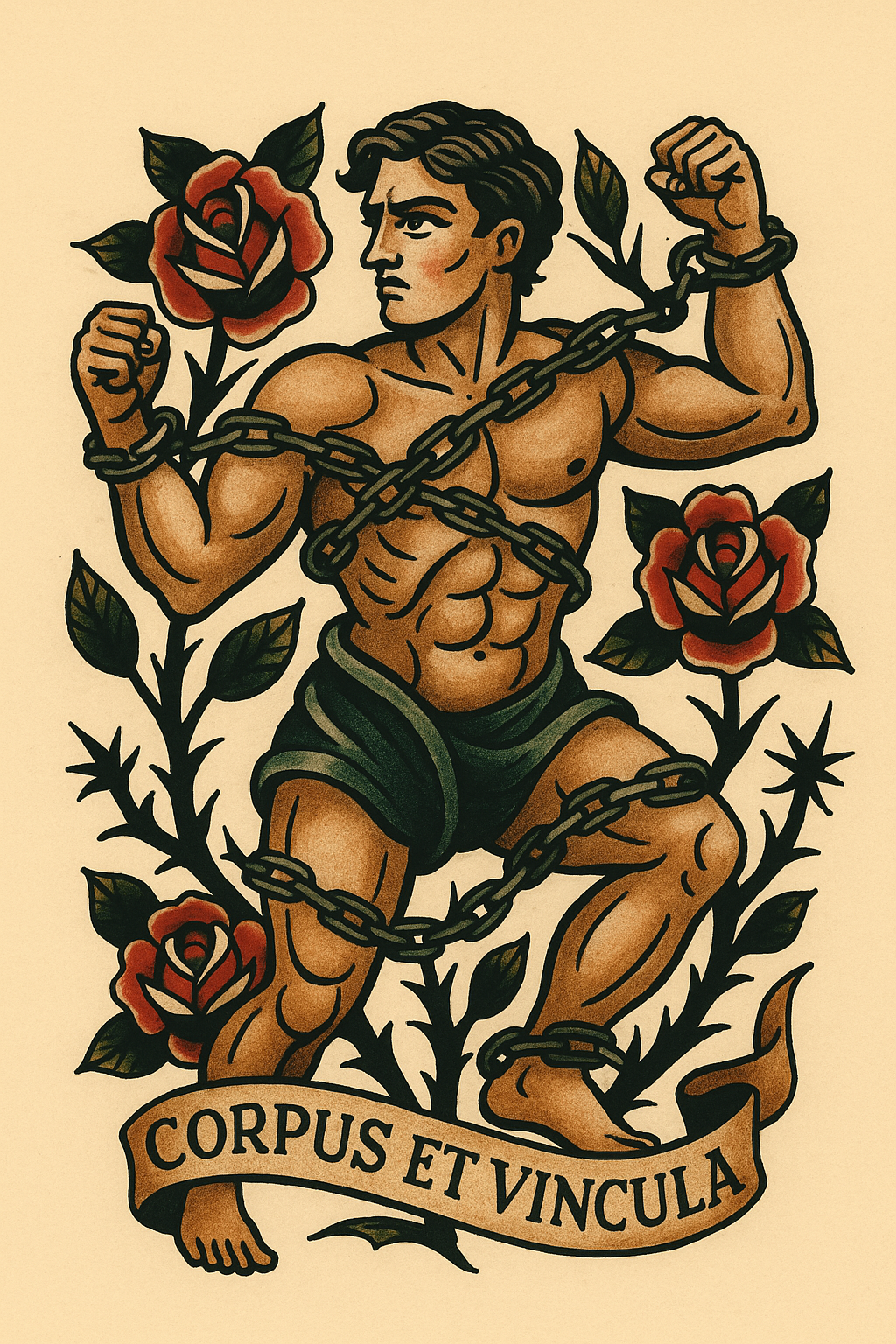 A classic tattoo design showcasing a muscular man bound by chains, surrounded by roses. The art is vividly colored against a soft beige background, highlighting the detailed features.