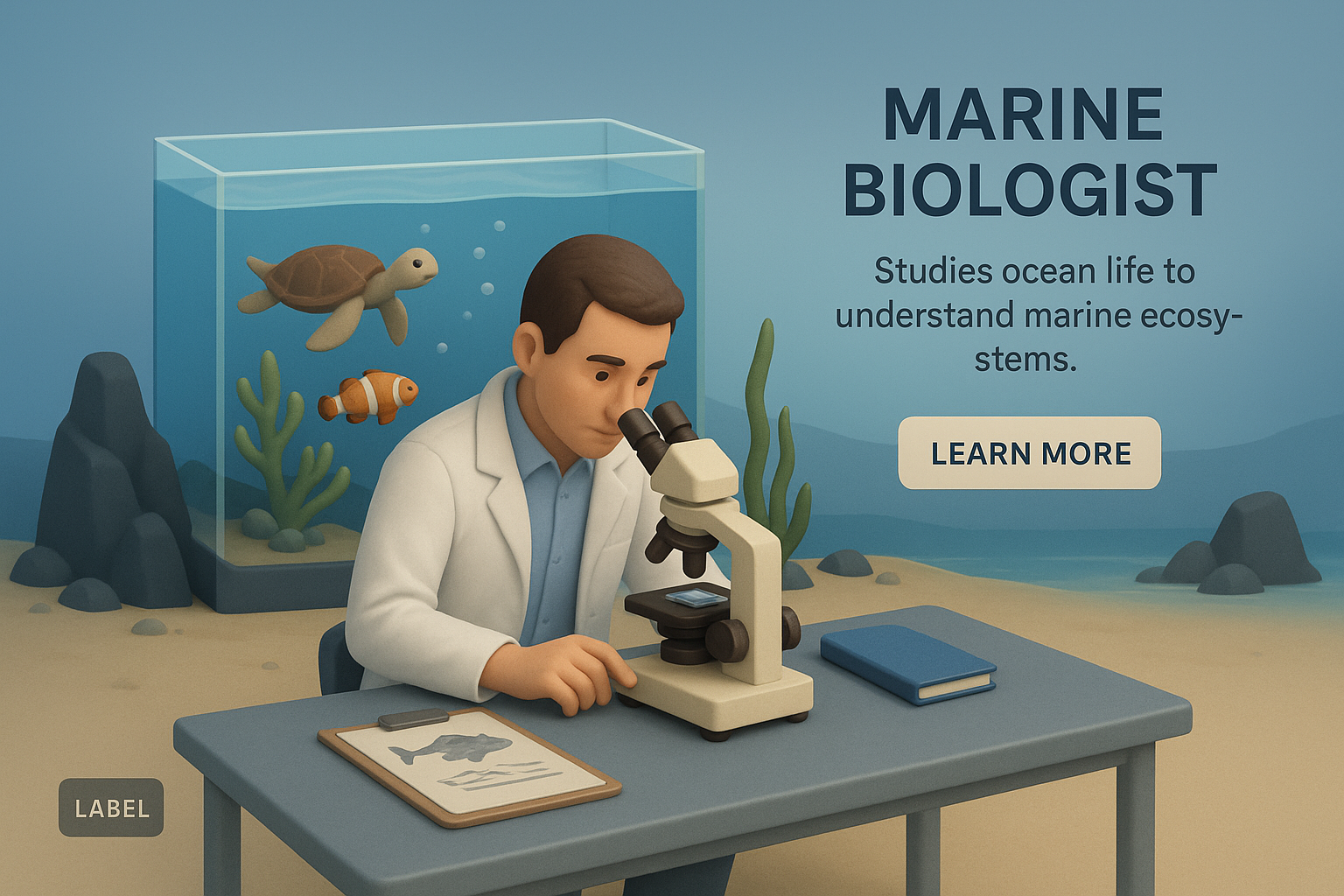 /Collection: /by davooda/Type: PNG/A zoomed-out 3D illustration depicting a marine biologist studying ocean life through a microscope, surrounded by aquatic elements. The scene includes a turtle and clownfish in a tank.