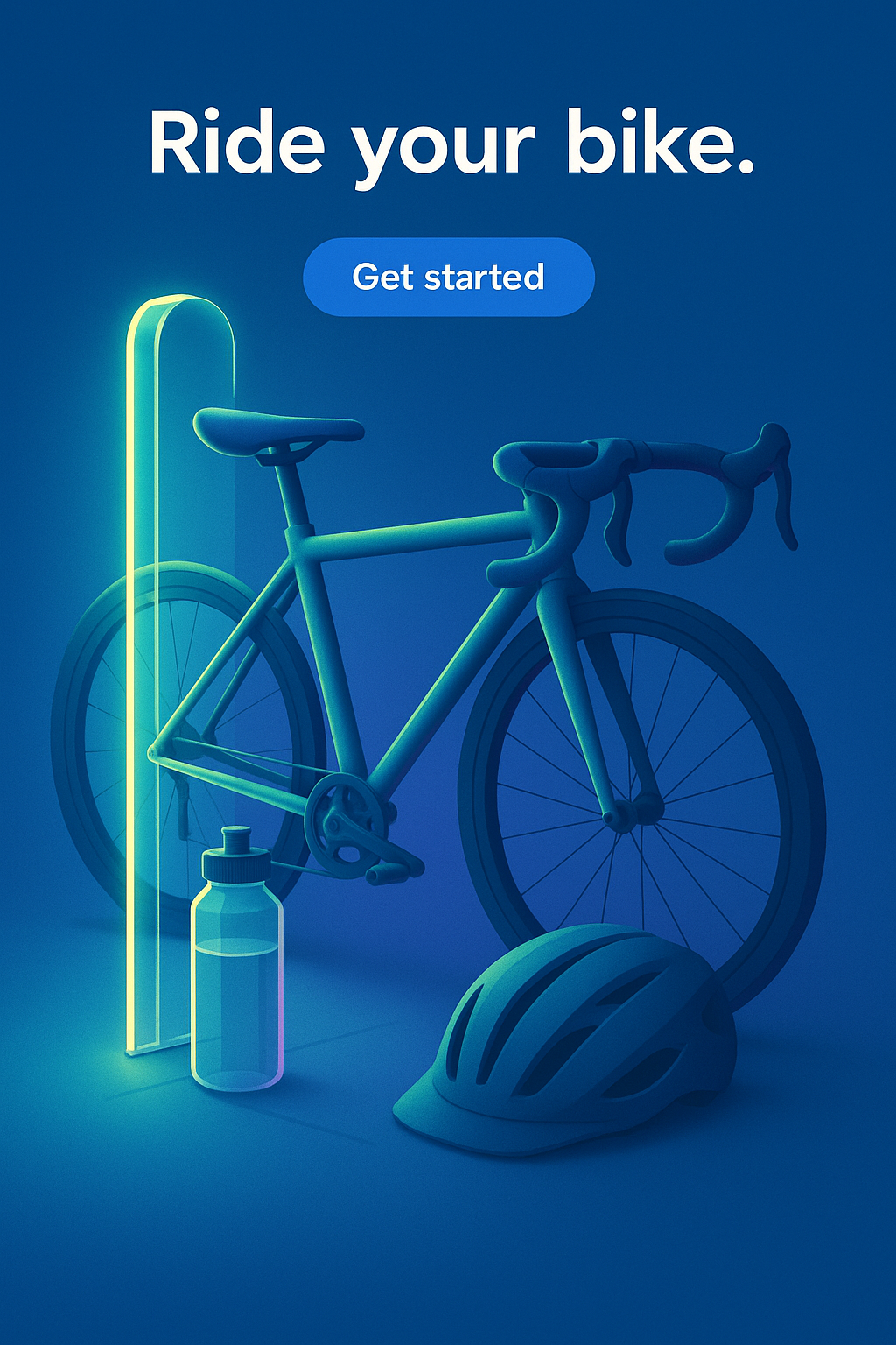 /Collection: /by davooda/Type: PNG/A visually striking composition featuring a bicycle, helmet, and water bottle, illuminated by soft neon lines against a solid blue background, creating a vibrant cycling atmosphere.