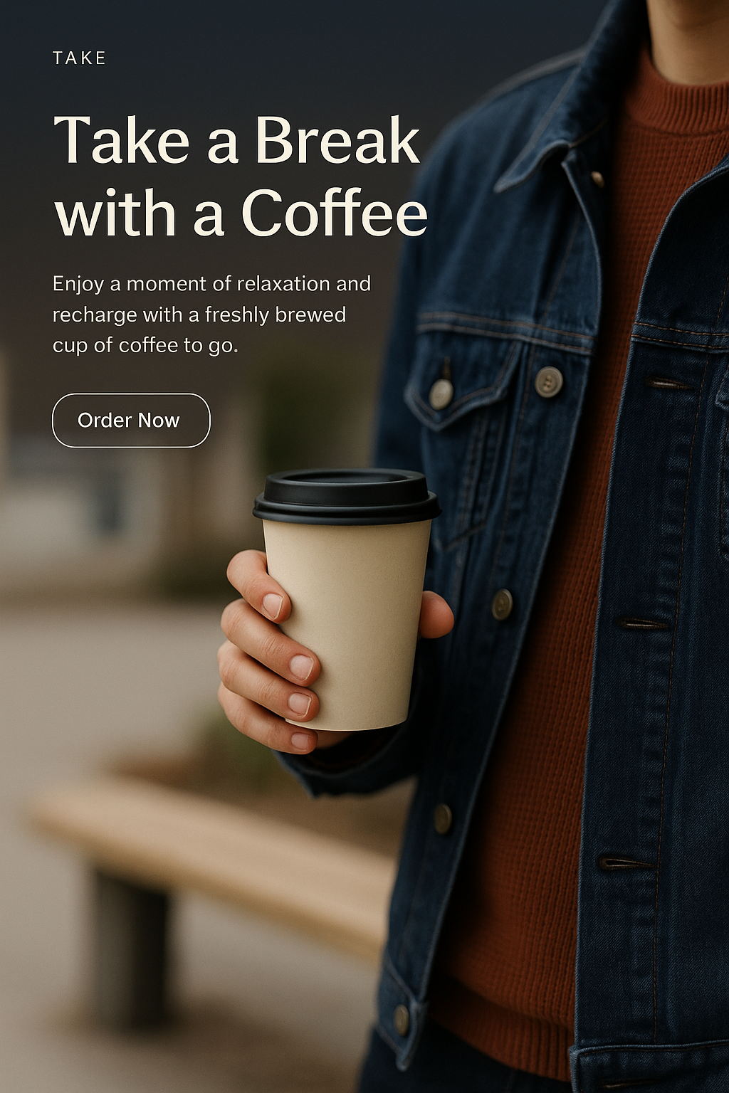 /Collection: /by davooda/Type: PNG/A modern web page design featuring a relaxed coffee theme. The layout includes a small label, a catchy headline, a brief text block, and a prominent action button for ordering coffee.