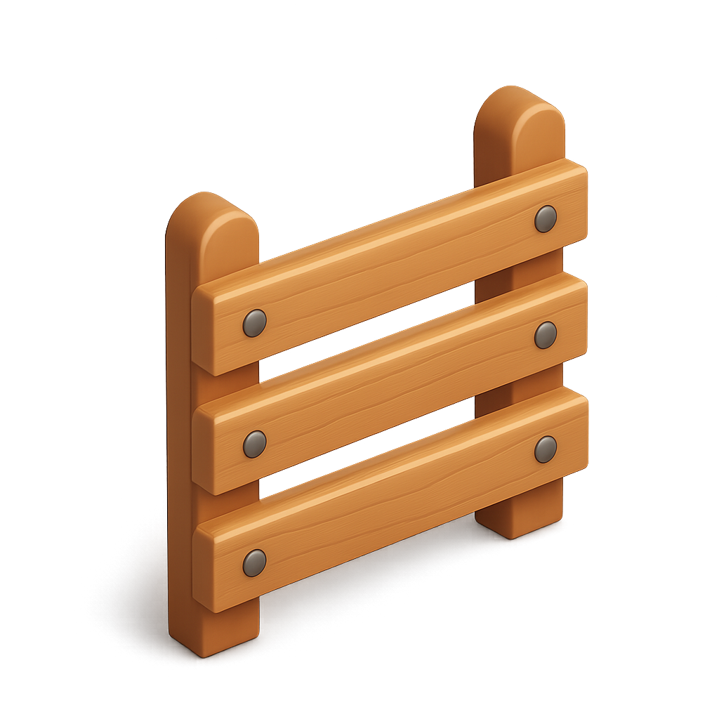 This image features a 3D icon of a wooden fence made up of three horizontal planks, secured with round metal bolts. The design is simple yet visually appealing, ideal for various digital applications.