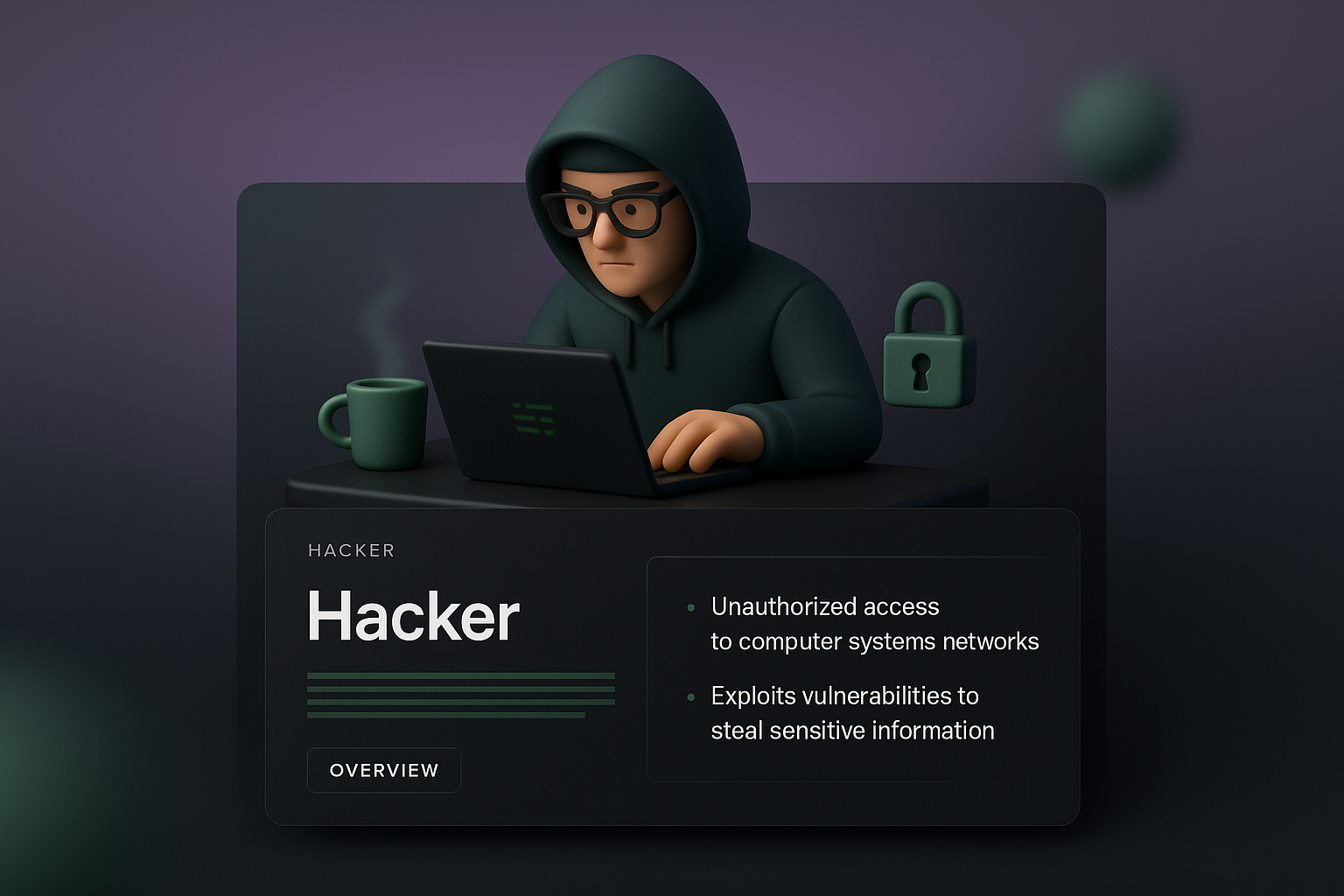 A stylized 3D illustration featuring a hacker in a hoodie working on a laptop, set against a gradient background. The design includes a text block with details about hacking activities.