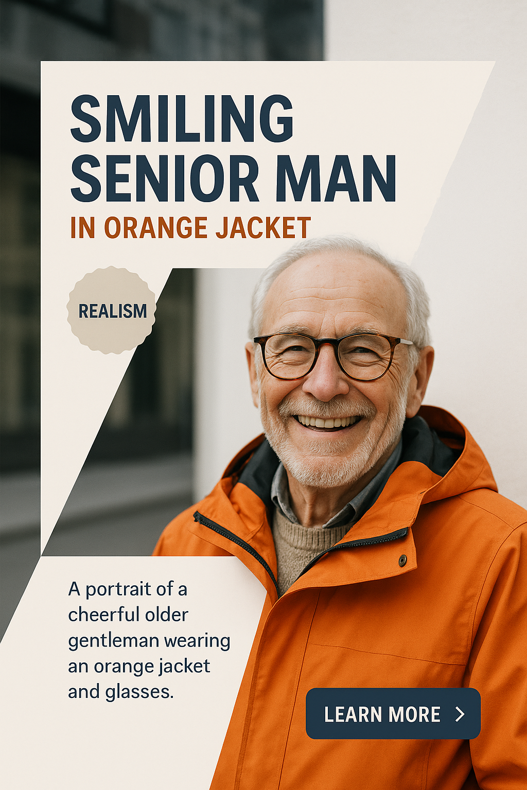 Smiling Senior Man in Orange Jacket Portrait with Realism Focus
