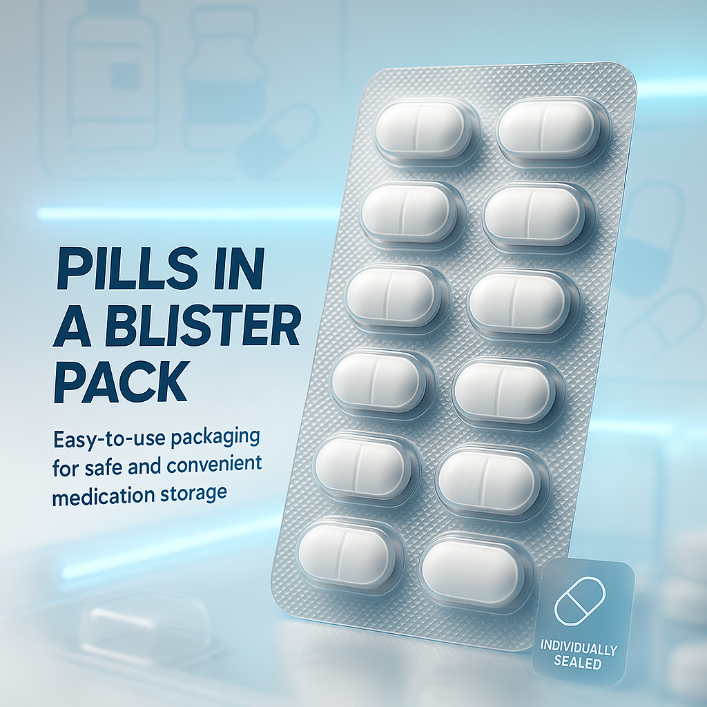 A sleek and modern representation of a blister pack containing pills, emphasizing easy-to-use packaging for medication. Ideal for pharmaceutical marketing and health-related content.
