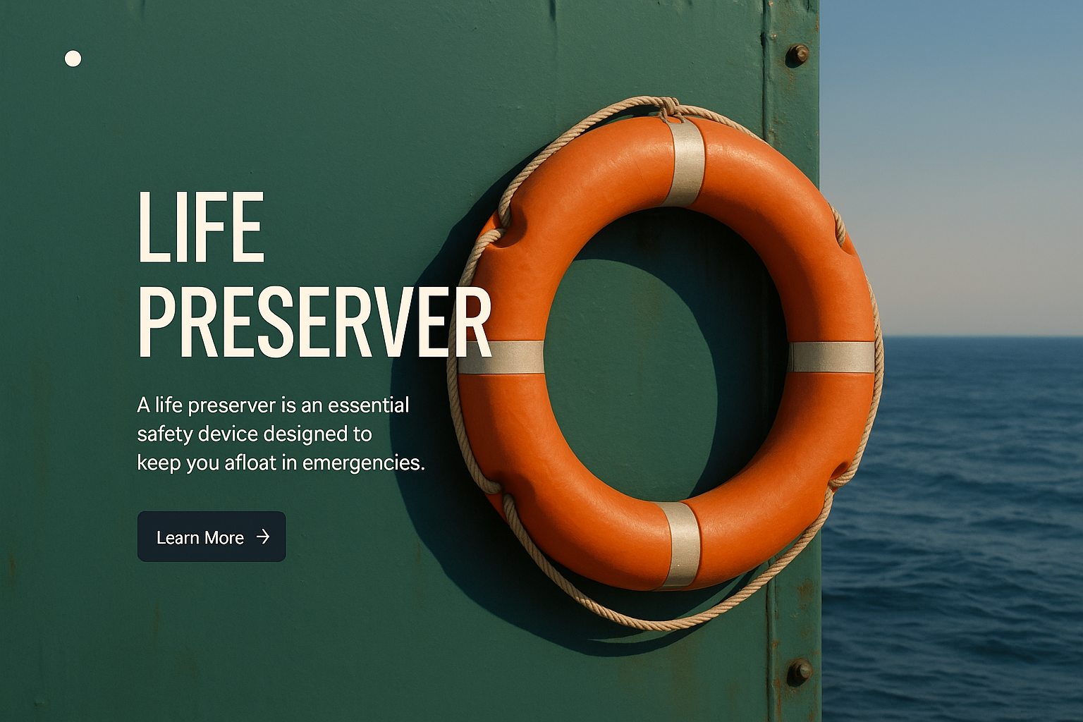 A modern web page design featuring a life preserver against a blue ocean backdrop. The layout includes a bold title, a brief description, and a prominent action button.