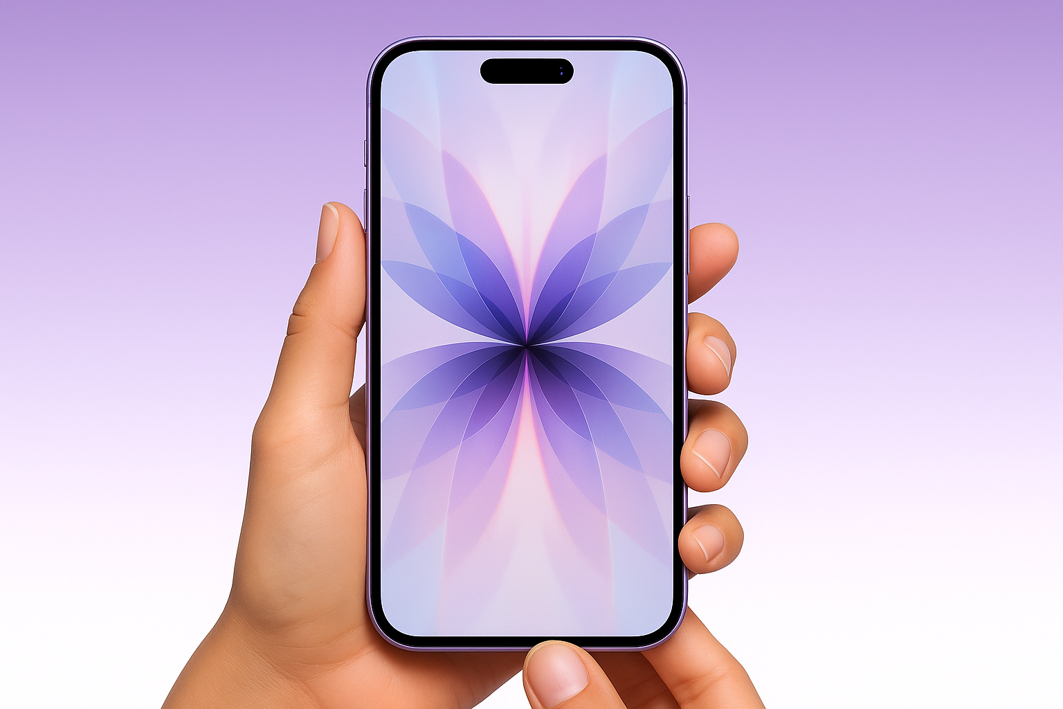 A purple phone is held in two hands, displaying an artistic, colorful design on its screen against a gradient background.