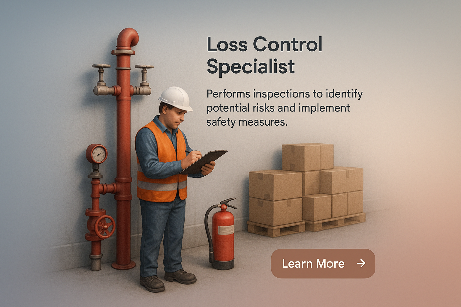 A detailed 3D scene depicting a Loss Control Specialist inspecting an area. The image features a gradient background, safety equipment, and clear text elements.