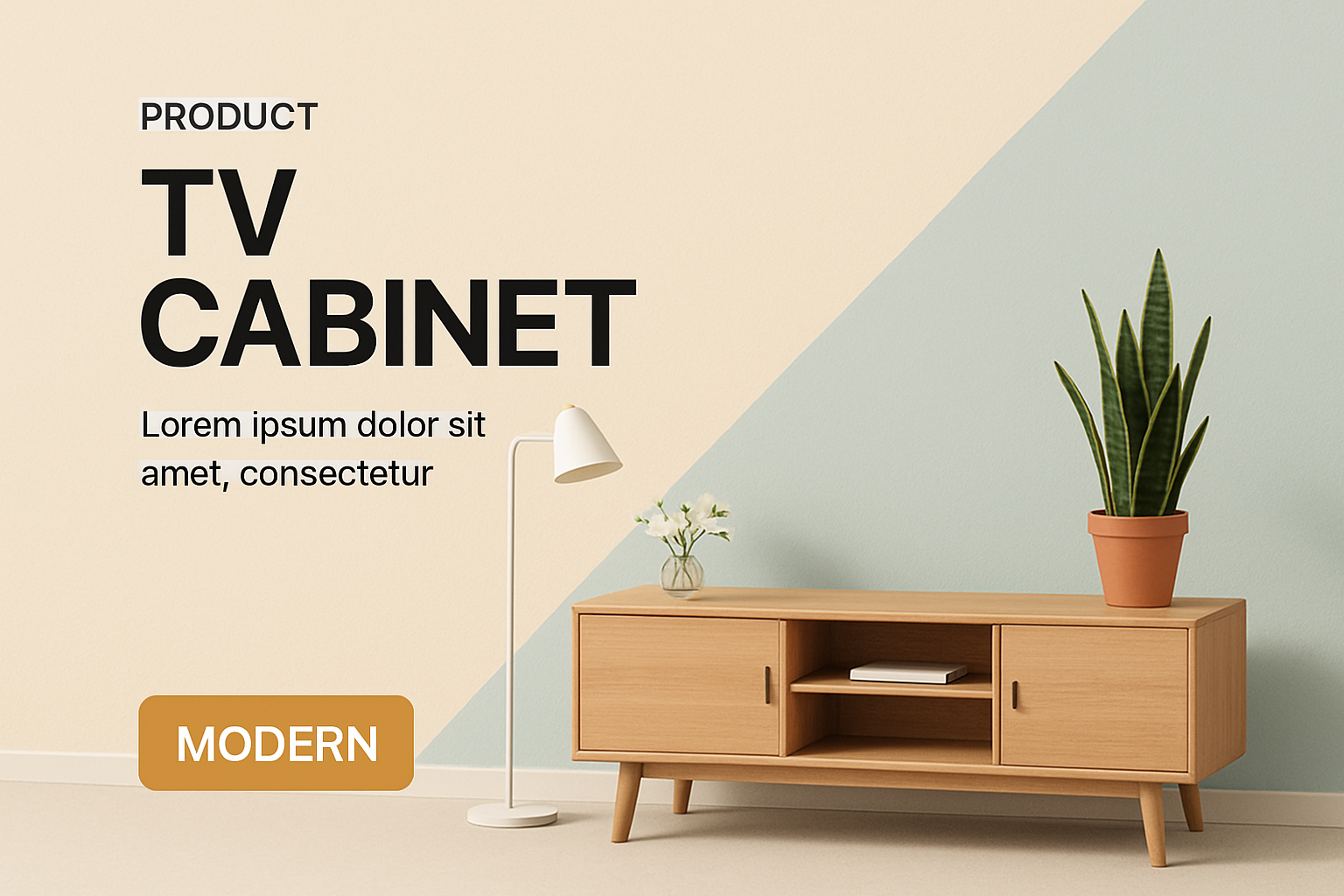 /Collection: /by davooda/Type: PNG/A contemporary living room setup featuring a sleek TV cabinet, a stylish lamp, and decorative plants. The background showcases contrasting light colors, enhancing the modern aesthetic.