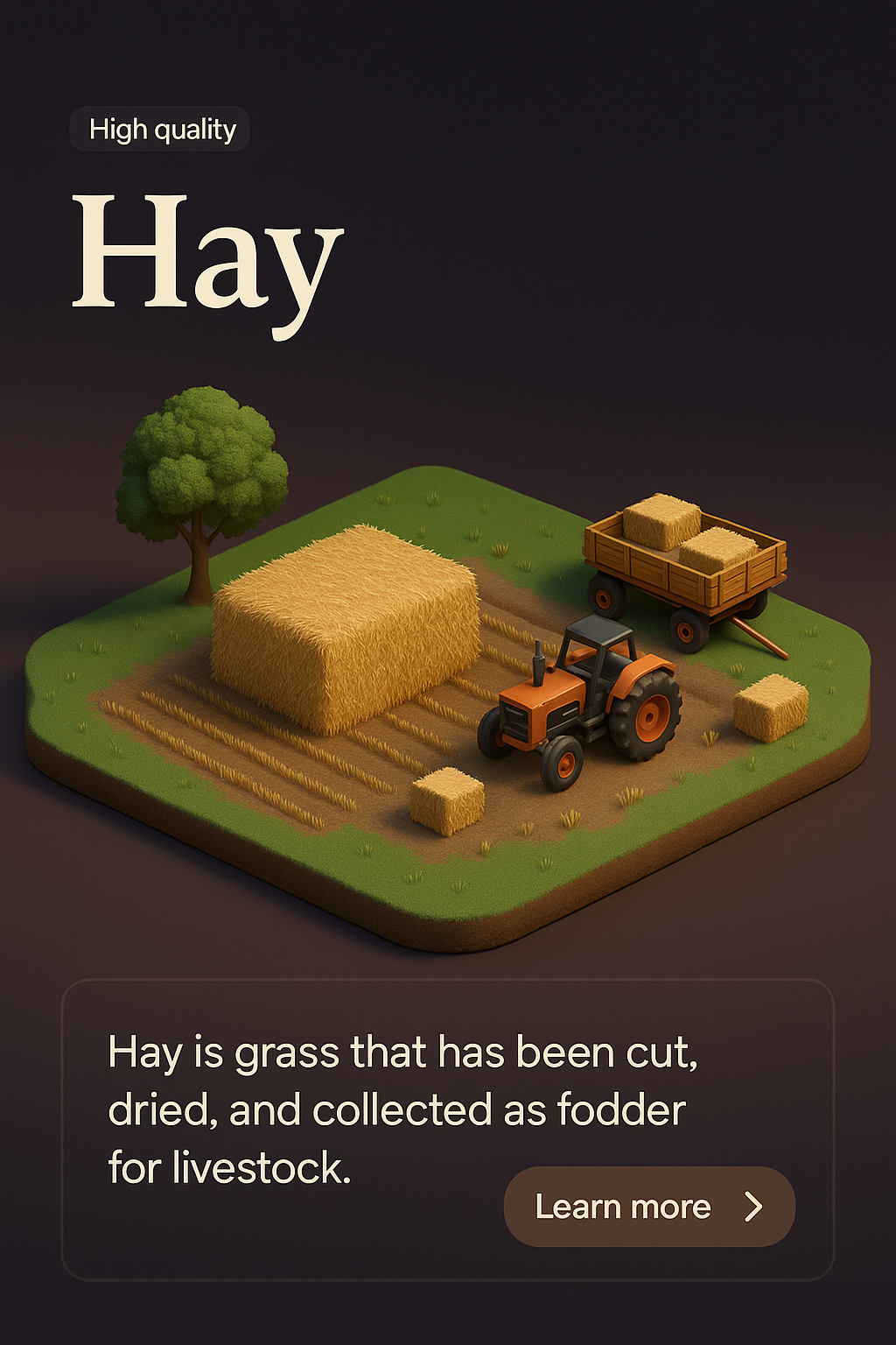 A detailed 3D illustration depicting a small-scale hay harvesting scene with a tractor, hay bales, and a tree on a dark gradient background. The design is realistic and well-composed.