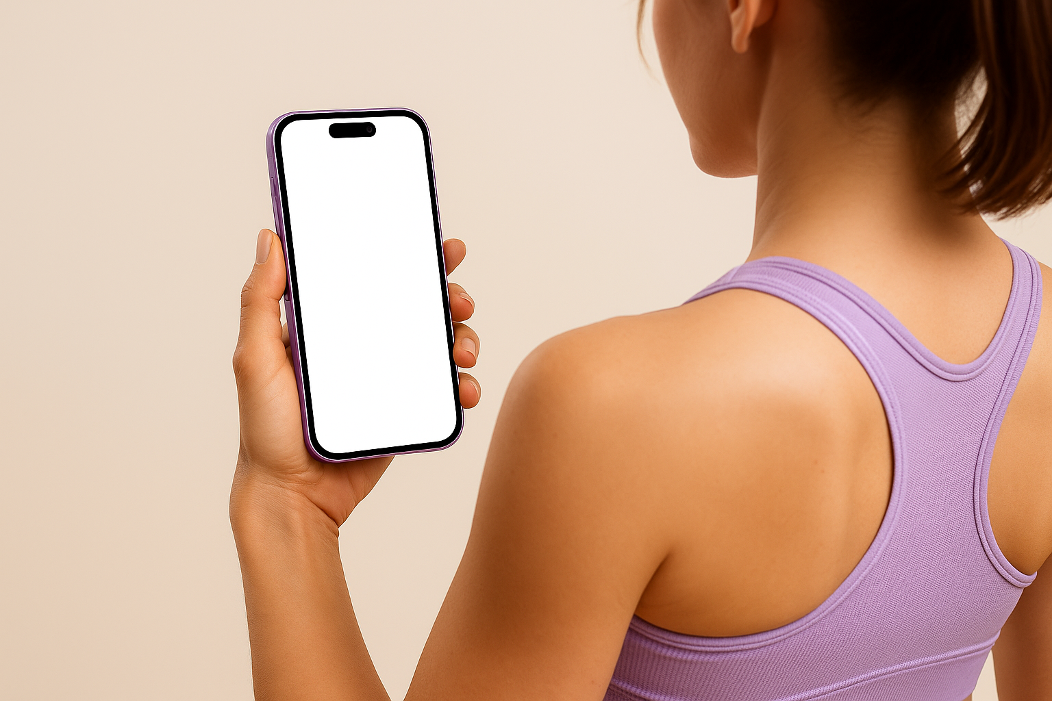 /Collection: /by davooda/Type: PNG/The image features a yoga instructor in a purple tank top holding a purple phone with a blank screen, viewed from behind. The setting highlights a dynamic and graceful pose.