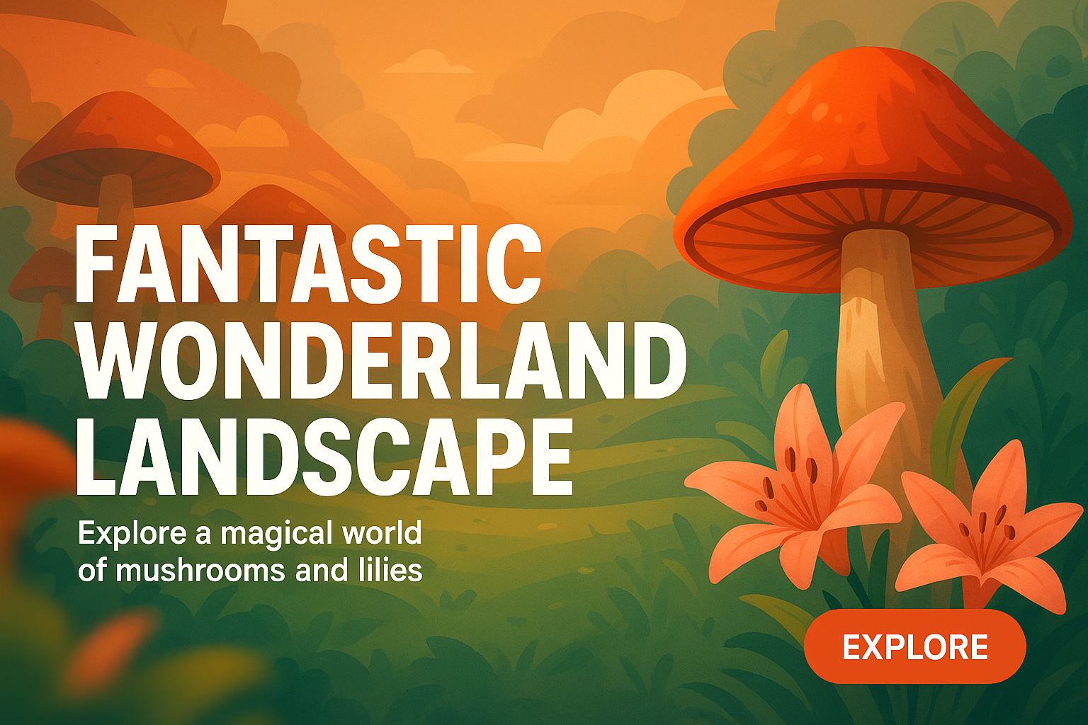 Vibrant illustration of a magical landscape showcasing oversized mushrooms and lilies, designed for use in fantasy-themed content or promotional materials.