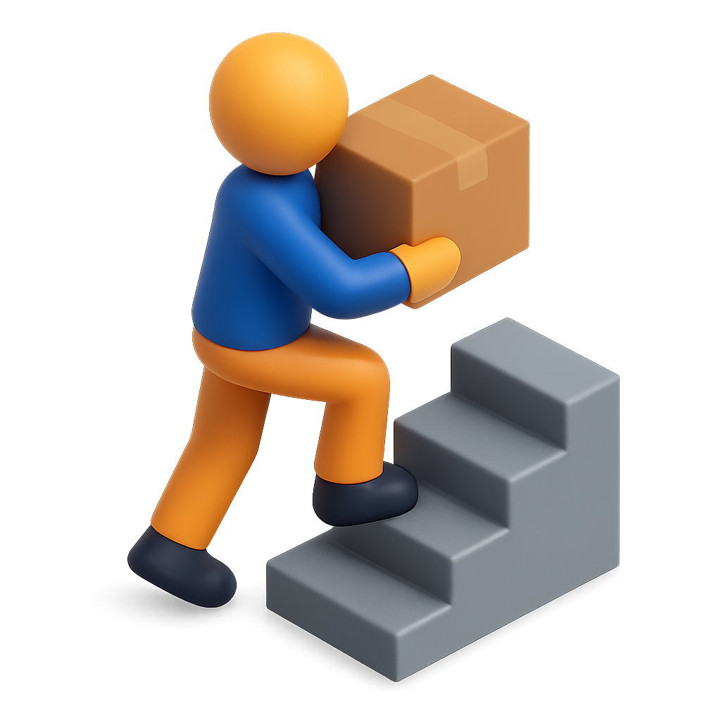 A stylized 3D icon depicting a character in a blue shirt and orange pants carrying a brown box while ascending gray stairs. The design features a transparent background and isometric perspective.