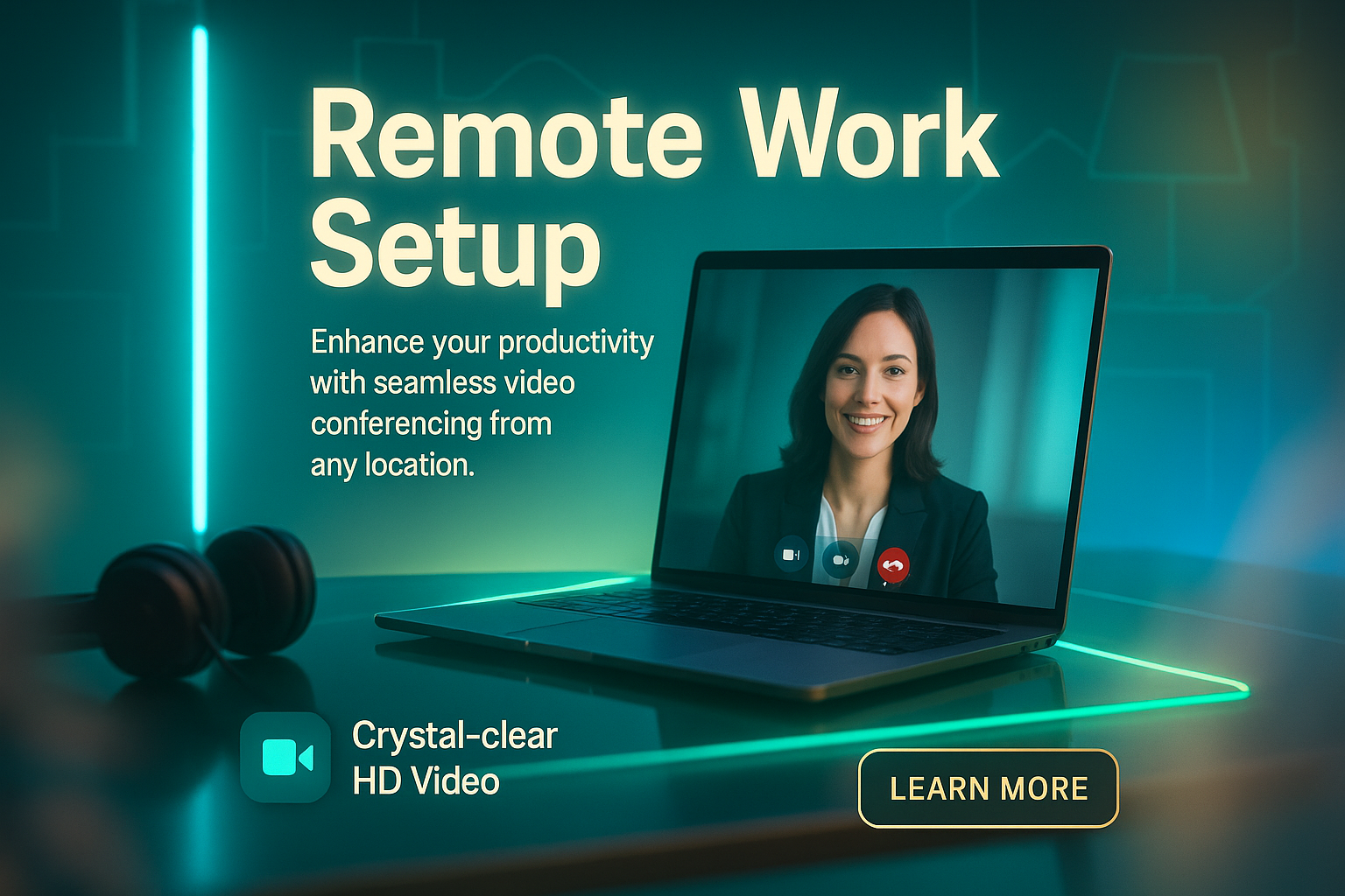 /Collection: /by davooda/Type: PNG/Visually appealing digital graphic showcasing a remote work setup featuring a laptop with video conferencing. Ideal for promoting productivity tools in a modern workplace context.