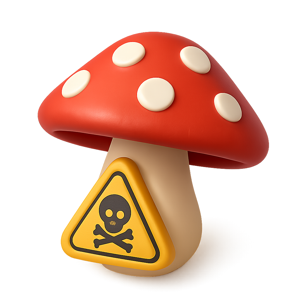 /Collection: /by davooda/Type: PNG/A vibrant 3D representation of a poisonous toadstool featuring a red cap with white spots and a hazard symbol, presented in an isometric view with a soft gradient background.