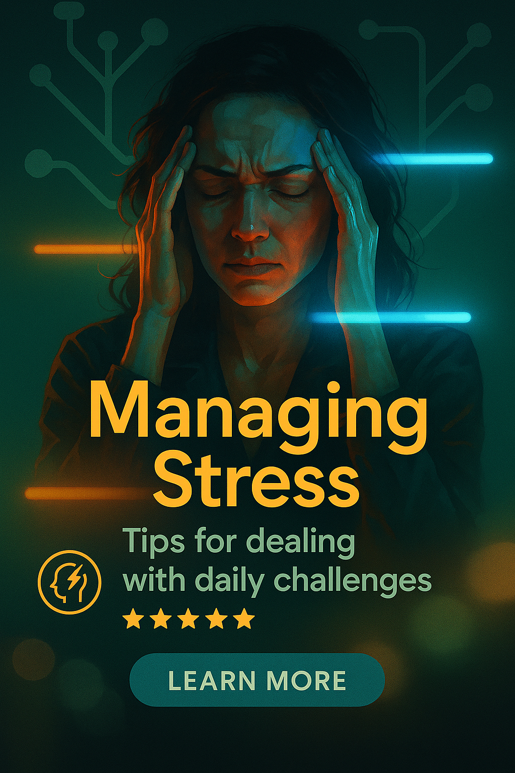 Illustrative graphic depicting stress management tips with a calming color palette, designed for mental health awareness and self-help resources.