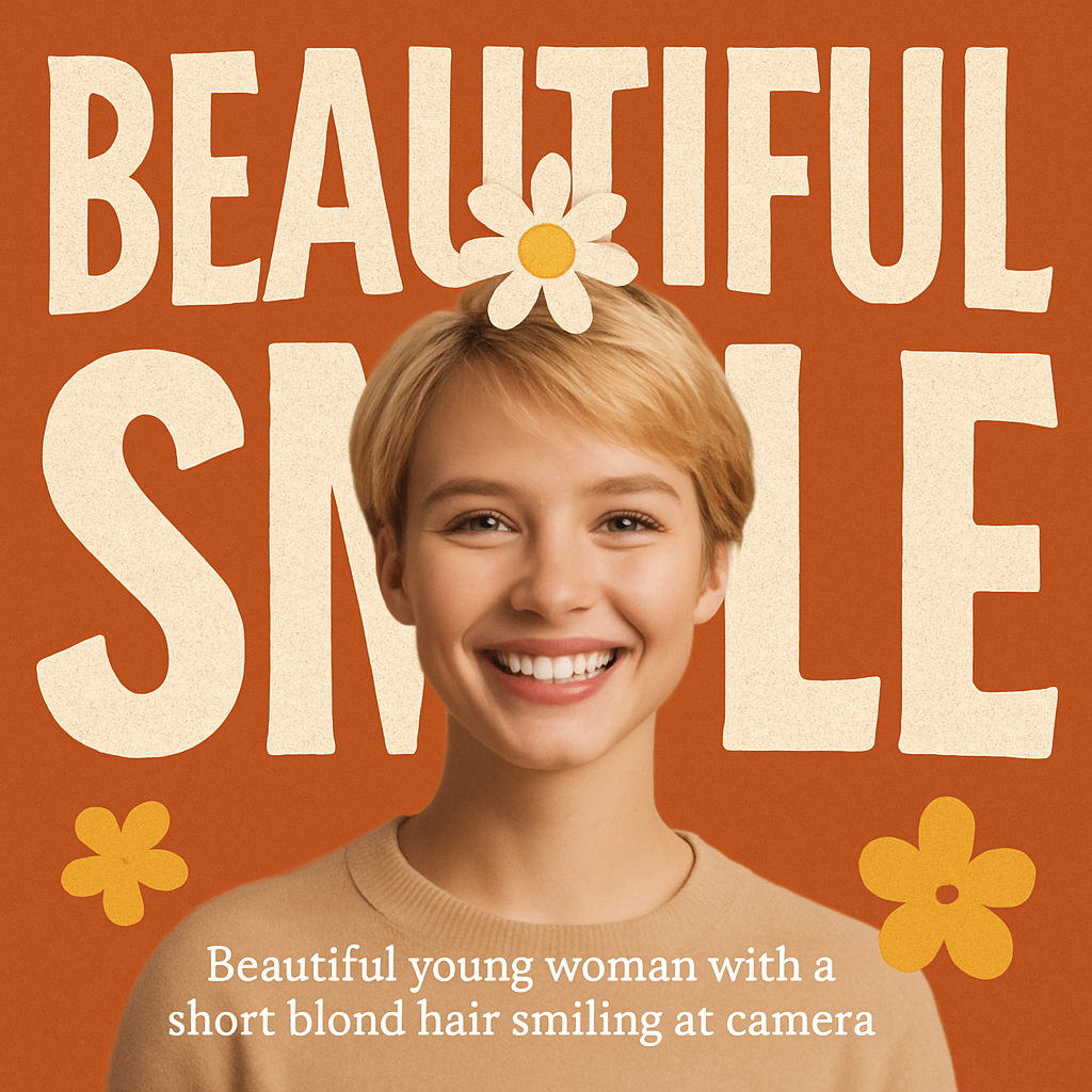 Vibrant social media post featuring a joyful young woman with blond hair and a warm smile, perfect for uplifting content and personal branding.