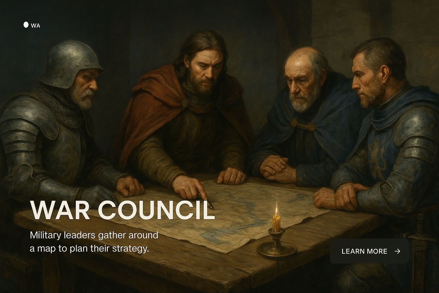 /Collection: /by davooda/Type: PNG/A group of four military leaders intensely discuss plans around a table. Illuminated by candlelight, the atmosphere is serious and focused, with a detailed map in front of them.