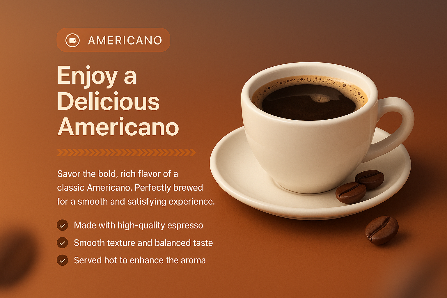 /Collection: /by davooda/Type: PNG/A visually appealing landing page design featuring a 3D illustration of Americano coffee. Highlighted features include flavor, quality, and aroma, with a warm color palette.