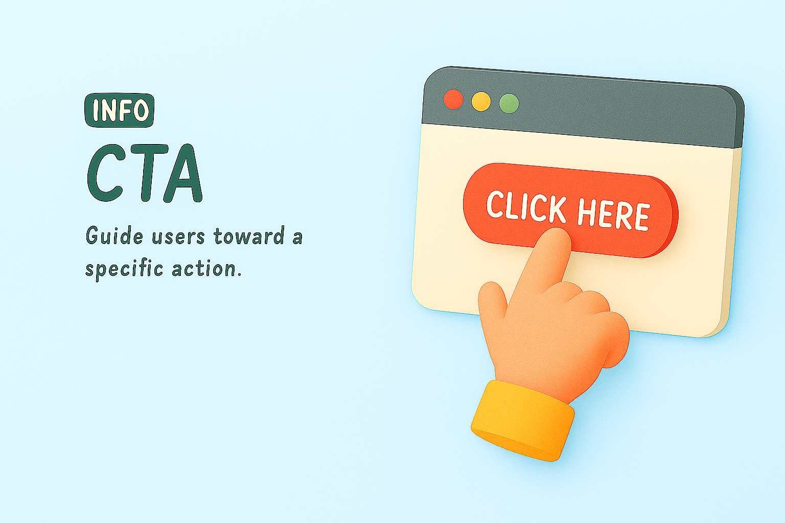 Vibrant 3D illustration featuring a hand pointing towards a clickable button, ideal for web design and marketing materials to encourage user engagement.