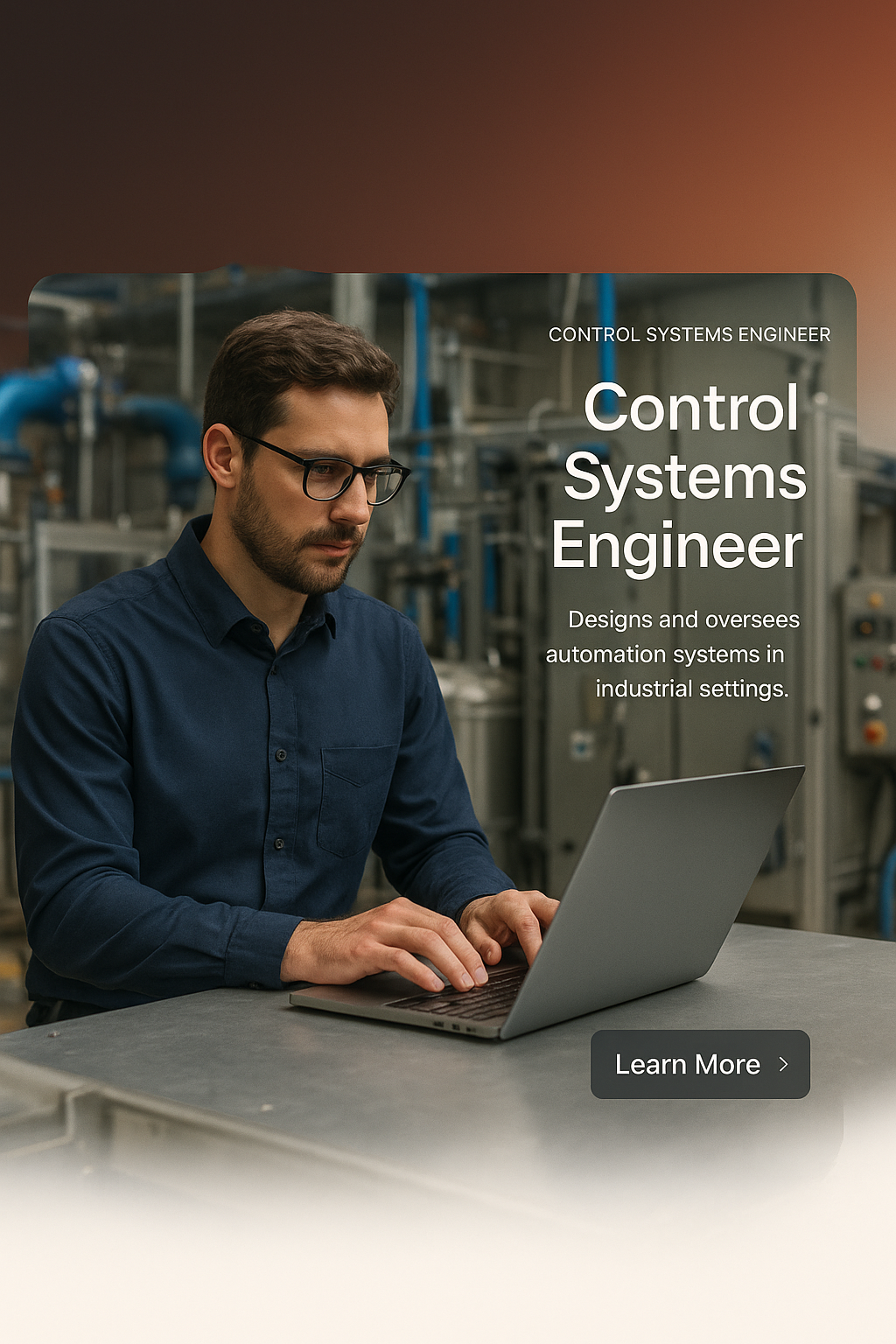/Collection: /by davooda/Type: PNG/A web page design featuring a Control Systems Engineer working on a laptop in an industrial setting. The layout includes a gradient background and an action button.