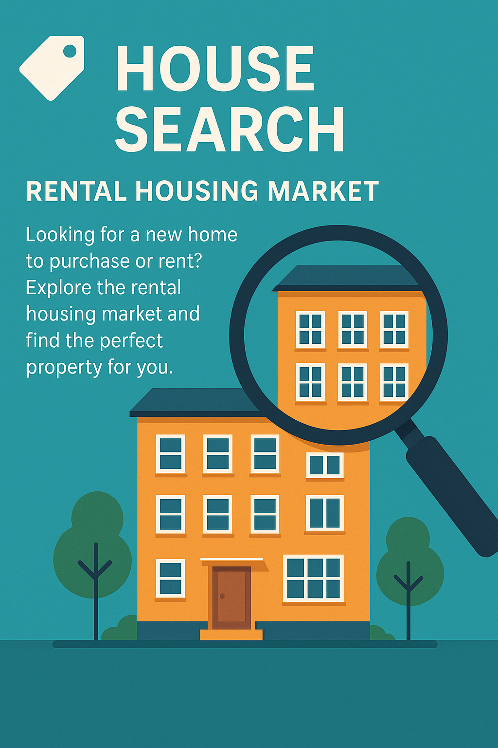 /Collection: /by davooda/Type: PNG/Informative graphic showcasing a house search theme, featuring a magnifying glass over a property, designed for real estate marketing. Ideal for online listings and brochures.