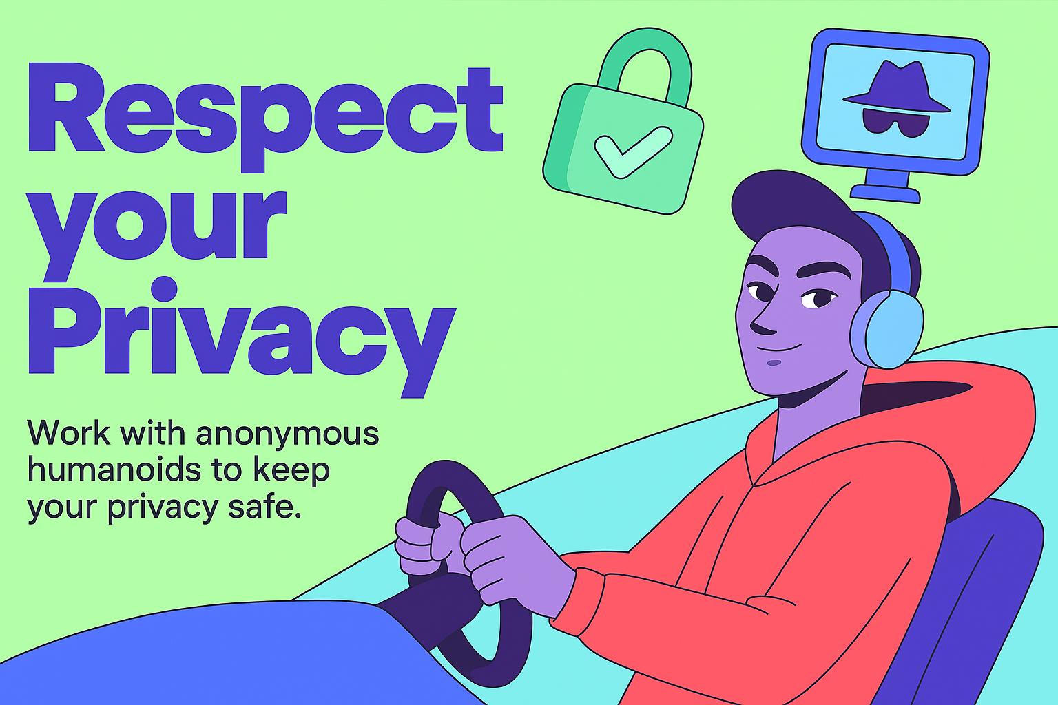 /Collection: /by davooda/Type: PNG/A vibrant illustration featuring a character in a hoodie driving while wearing headphones. The background is bright green with icons symbolizing privacy and security.