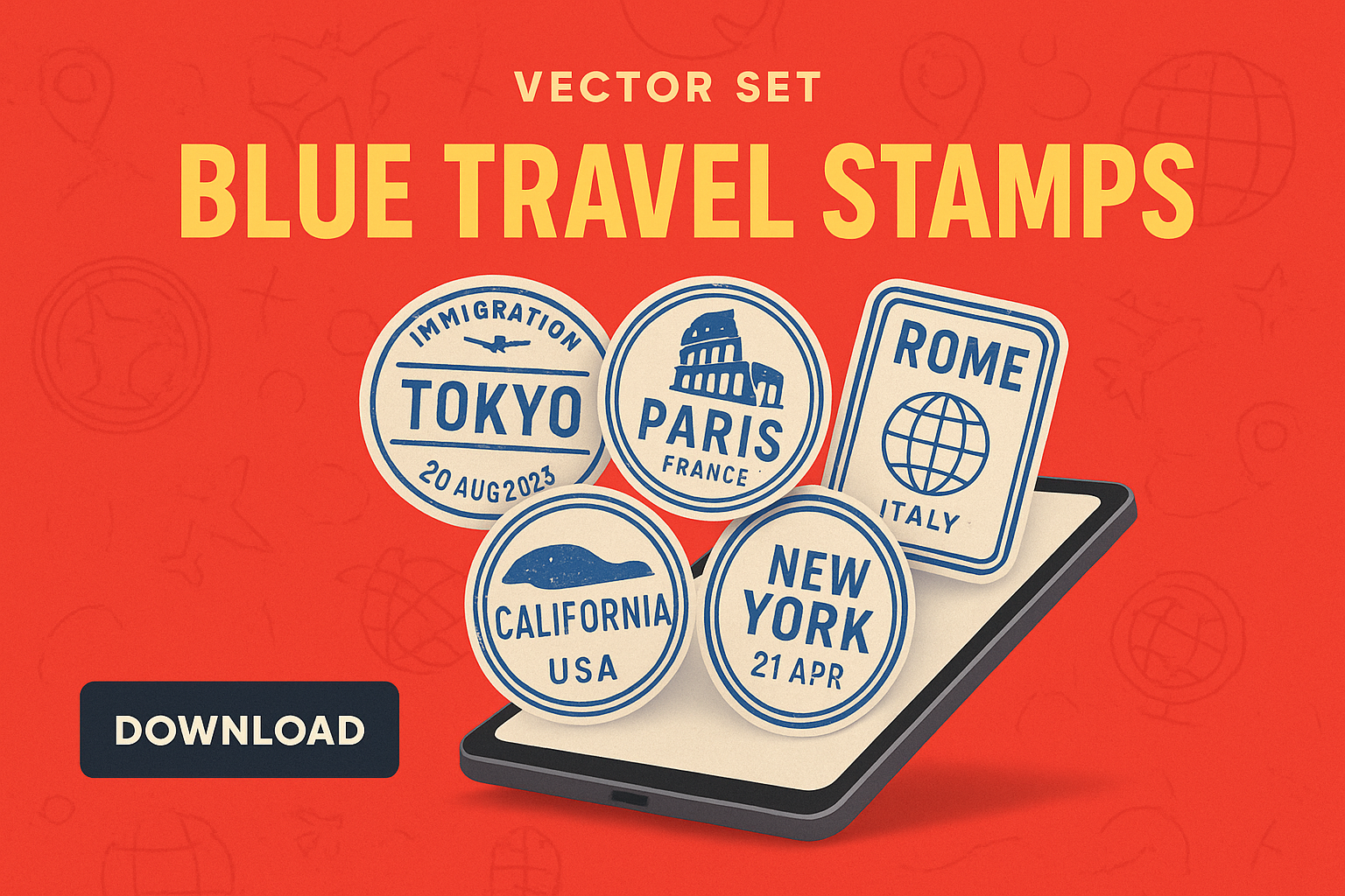 /Collection: /by davooda/Type: PNG/A modern, playful design showcasing blue passport stamps from various cities like Tokyo, Paris, and California. The composition features a tablet and bold typography, creating an engaging travel-themed advertisement.