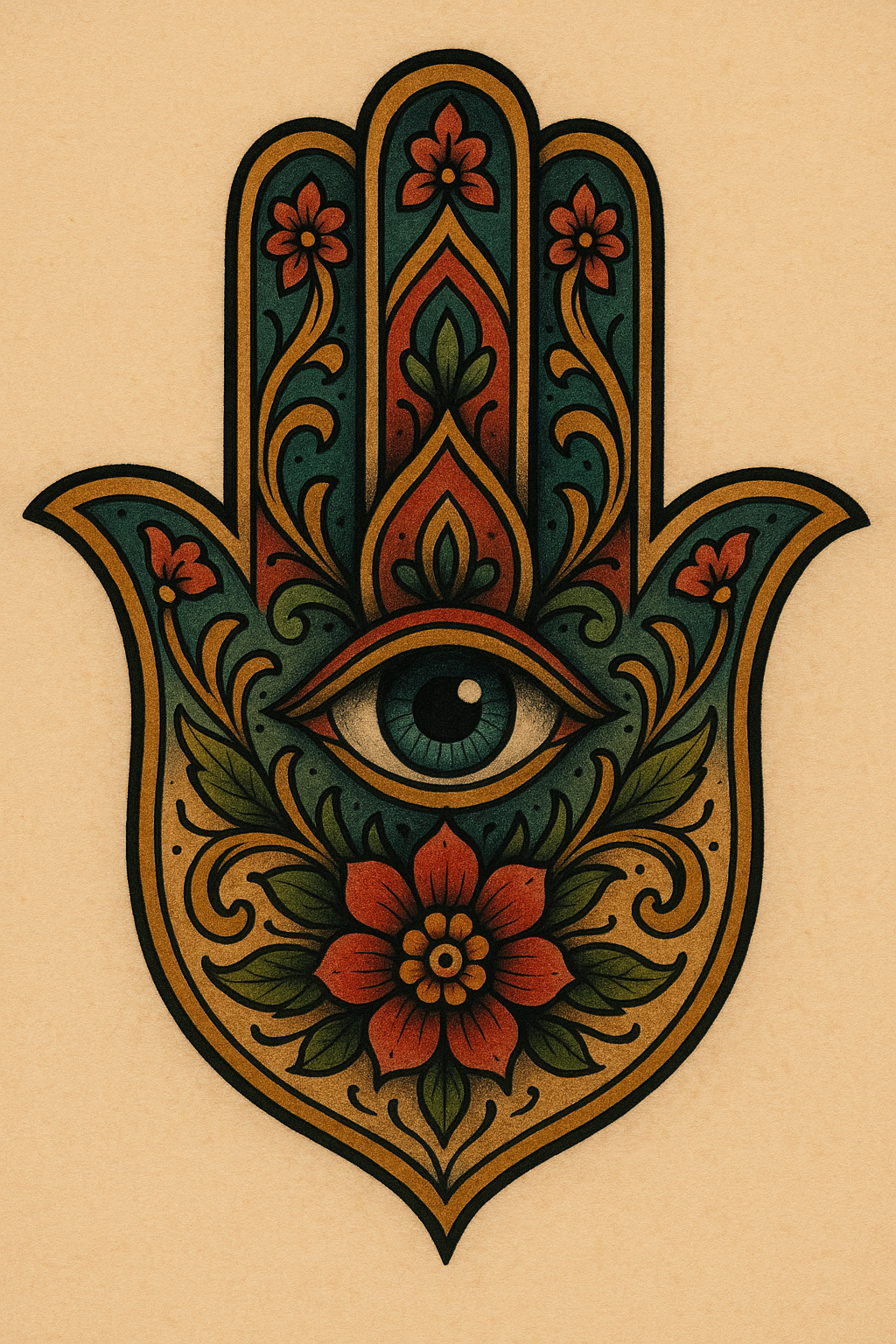 Intricate Hamsa Hand Design with Eye and Floral Elements